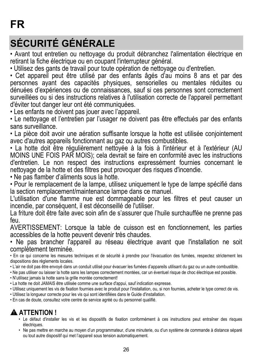 FR SÉCURITÉ GÉNÉRALE • Avant tout entretien ou nettoyage du produit débranchez l'alimentation électrique en retirant la fiche électrique ou en coupant l'interrupteur général. • Utilisez des gants de travail pour toute opération de nettoyage ou d'entretien. • Cet appareil peut être utilisé par des enfants âgés d’au moins 8 ans et par des personnes ayant des capacités physiques, sensorielles ou mentales réduites ou dénuées d’expériences ou de connaissances, sauf si ces personnes sont correctement surveillées ou si des instructions relatives à l'utilisation correcte de l'appareil permettant d'éviter tout danger leur ont été communiquées. • Les enfants ne doivent pas jouer avec l’appareil. • Le nettoyage et l’entretien par l’usager ne doivent pas être effectués par des enfants sans surveillance. • La pièce doit avoir une aération suffisante lorsque la hotte est utilisée conjointement avec d'autres appareils fonctionnant au gaz ou autres combustibles. • La hotte doit être régulièrement nettoyée à la fois à l'intérieur et à l'extérieur (AU MOINS UNE FOIS PAR MOIS); cela devrait se faire en conformité avec les instructions d'entretien. Le non respect des instructions expressément fournies concernant le nettoyage de la hotte et des filtres peut provoquer des risques d'incendie. • Ne pas flamber d’aliments sous la hotte. • Pour le remplacement de la lampe, utilisez uniquement le type de lampe spécifié dans la section remplacement/maintenance lampe dans ce manuel. L'utilisation d'une flamme nue est dommageable pour les filtres et peut causer un incendie, par conséquent, il est déconseillé de l'utiliser. La friture doit être faite avec soin afin de s’assurer que l’huile surchauffée ne prenne pas feu. AVERTISSEMENT: Lorsque la table de cuisson est en fonctionnement, les parties accessibles de la hotte peuvent devenir très chaudes. • Ne pas brancher l'appareil au réseau électrique avant que l'installation ne soit complètement terminée.