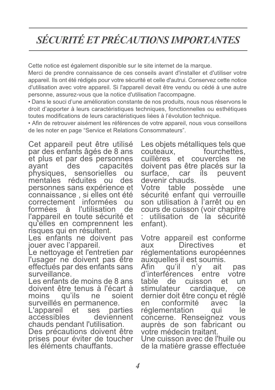 Les objets métalliques tels que couteaux, fourchettes, cuillères et couvercles ne doivent pas être placés sur la surface, car ils peuvent devenir chauds. Votre table possède une sécurité enfant qui verrouille son utilisation à l’arrêt ou en cours de cuisson (voir chapitre : utilisation de la sécurité enfant). Votre appareil est conforme aux Directives et réglementations européennes auxquelles il est soumis. Afin qu’il n’y ait pas d’interférences entre votre table de cuisson et un stimulateur cardiaque, ce dernier doit être conçu et réglé en conformité avec la réglementation qui le concerne. Renseignez vous auprès de son fabricant ou votre médecin traitant. Une cuisson avec de l'huile ou de la matière grasse effectuée 4