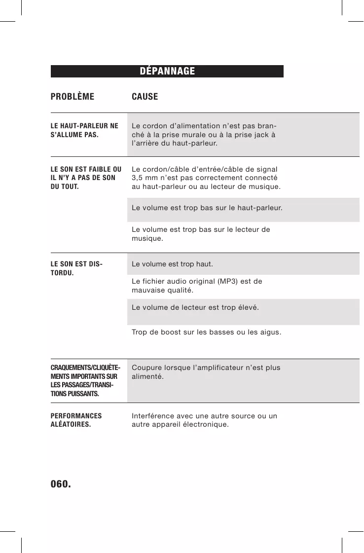 IL N’Y A PAS DE SON DU TOUT. Le cordon/câble d’entrée/câble de signal 3,5 mm n’est pas correctement connecté au haut-parleur ou au lecteur de musique. Le volume est trop bas sur le haut-parleur. Le volume est trop bas sur le lecteur de musique. LE SON EST DISTORDU. Le volume est trop haut. Le fichier audio original (MP3) est de mauvaise qualité. Le volume de lecteur est trop élevé. Trop de boost sur les basses ou les aigus.