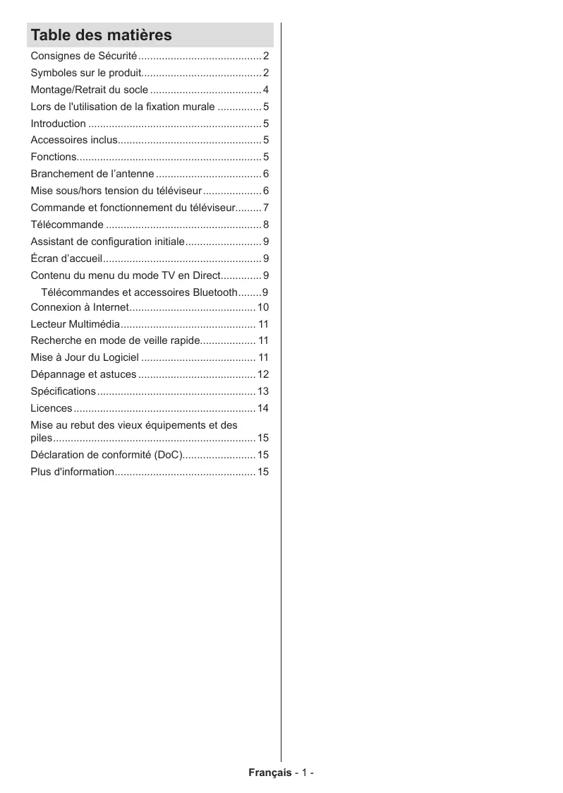 Montage/Retrait du socle 4 Lors de l'utilisation de la fixation murale 5 Introduction 5 Accessoires inclus 5 Fonctions 5 Branchement de l’antenne 6 Connexion à Internet 10 Lecteur Multimédia 11 Recherche en mode de veille rapide 11 Mise à Jour du Logiciel 11 Dépannage et astuces 12 Spécifications 13 Licences 14 Mise au rebut des vieux équipements et des piles 15 Déclaration de conformité (DoC) 15 Plus d'information 15