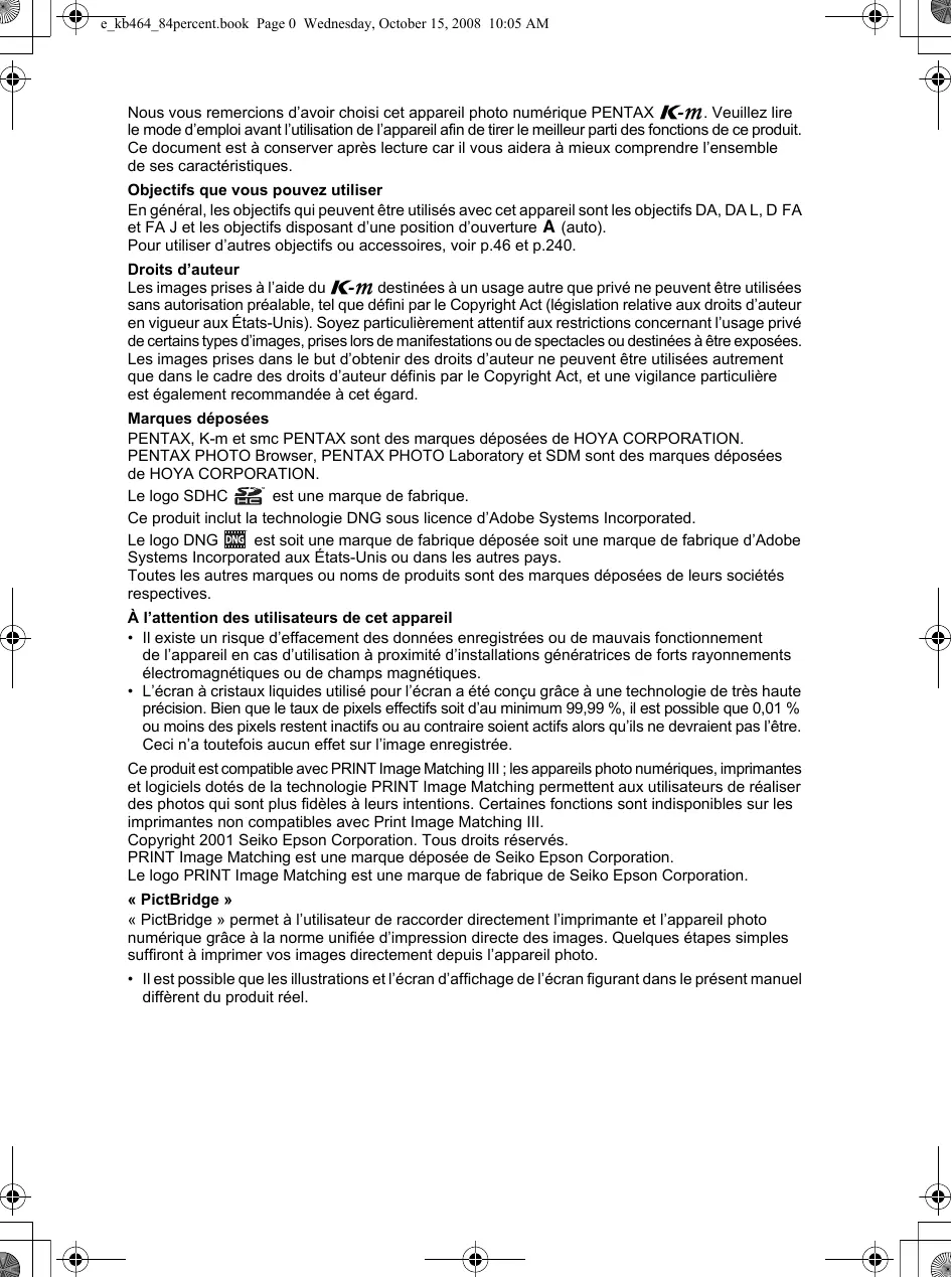 e_kb464_84percent.book Page 0 Wednesday, October 15, 2008 10:05 AM Nous vous remercions d’avoir choisi cet appareil photo numérique PENTAX e. Veuillez lire le mode d’emploi avant l’utilisation de l’appareil afin de tirer le meilleur parti des fonctions de ce produit. Ce document est à conserver après lecture car il vous aidera à mieux comprendre l’ensemble de ses caractéristiques. Objectifs que vous pouvez utiliser En général, les objectifs qui peuvent être utilisés avec cet appareil sont les objectifs DA, DA L, D FA et FA J et les objectifs disposant d’une position d’ouverture s (auto). Pour utiliser d’autres objectifs ou accessoires, voir p.46 et p.240. Droits d’auteur Les images prises à l’aide du e destinées à un usage autre que privé ne peuvent être utilisées sans autorisation préalable, tel que défini par le Copyright Act (législation relative aux droits d’auteur en vigueur aux États-Unis). Soyez particulièrement attentif aux restrictions concernant l’usage privé de certains types d’images, prises lors de manifestations ou de spectacles ou destinées à être exposées. Les images prises dans le but d’obtenir des droits d’auteur ne peuvent être utilisées autrement que dans le cadre des droits d’auteur définis par le Copyright Act, et une vigilance particulière est également recommandée à cet égard. Marques déposées PENTAX, K-m et smc PENTAX sont des marques déposées de HOYA CORPORATION. PENTAX PHOTO Browser, PENTAX PHOTO Laboratory et SDM sont des marques déposées de HOYA CORPORATION. Le logo SDHC est une marque de fabrique. Ce produit inclut la technologie DNG sous licence d’Adobe Systems Incorporated. Le logo DNG est soit une marque de fabrique déposée soit une marque de fabrique d’Adobe Systems Incorporated aux États-Unis ou dans les autres pays. Toutes les autres marques ou noms de produits sont des marques déposées de leurs sociétés respectives. À l’attention des utilisateurs de cet appareil • Il existe un risque d’effacement des données enregistrées ou de mauvais fonctionnement de l’appareil en cas d’utilisation à proximité d’installations génératrices de forts rayonnements électromagnétiques ou de champs magnétiques. • L’écran à cristaux liquides utilisé pour l’écran a été conçu grâce à une technologie de très haute précision. Bien que le taux de pixels effectifs soit d’au minimum 99,99 %, il est possible que 0,01 % ou moins des pixels restent inactifs ou au contraire soient actifs alors qu’ils ne devraient pas l’être. Ceci n’a toutefois aucun effet sur l’image enregistrée. Ce produit est compatible avec PRINT Image Matching III ; les appareils photo numériques, imprimantes et logiciels dotés de la technologie PRINT Image Matching permettent aux utilisateurs de réaliser des photos qui sont plus fidèles à leurs intentions. Certaines fonctions sont indisponibles sur les imprimantes non compatibles avec Print Image Matching III. Copyright 2001 Seiko Epson Corporation. Tous droits réservés. PRINT Image Matching est une marque déposée de Seiko Epson Corporation. Le logo PRINT Image Matching est une marque de fabrique de Seiko Epson Corporation. « PictBridge » « PictBridge » permet à l’utilisateur de raccorder directement l’imprimante et l’appareil photo numérique grâce à la norme unifiée d’impression directe des images. Quelques étapes simples suffiront à imprimer vos images directement depuis l’appareil photo. • Il est possible que les illustrations et l’écran d’affichage de l’écran figurant dans le présent manuel diffèrent du produit réel.