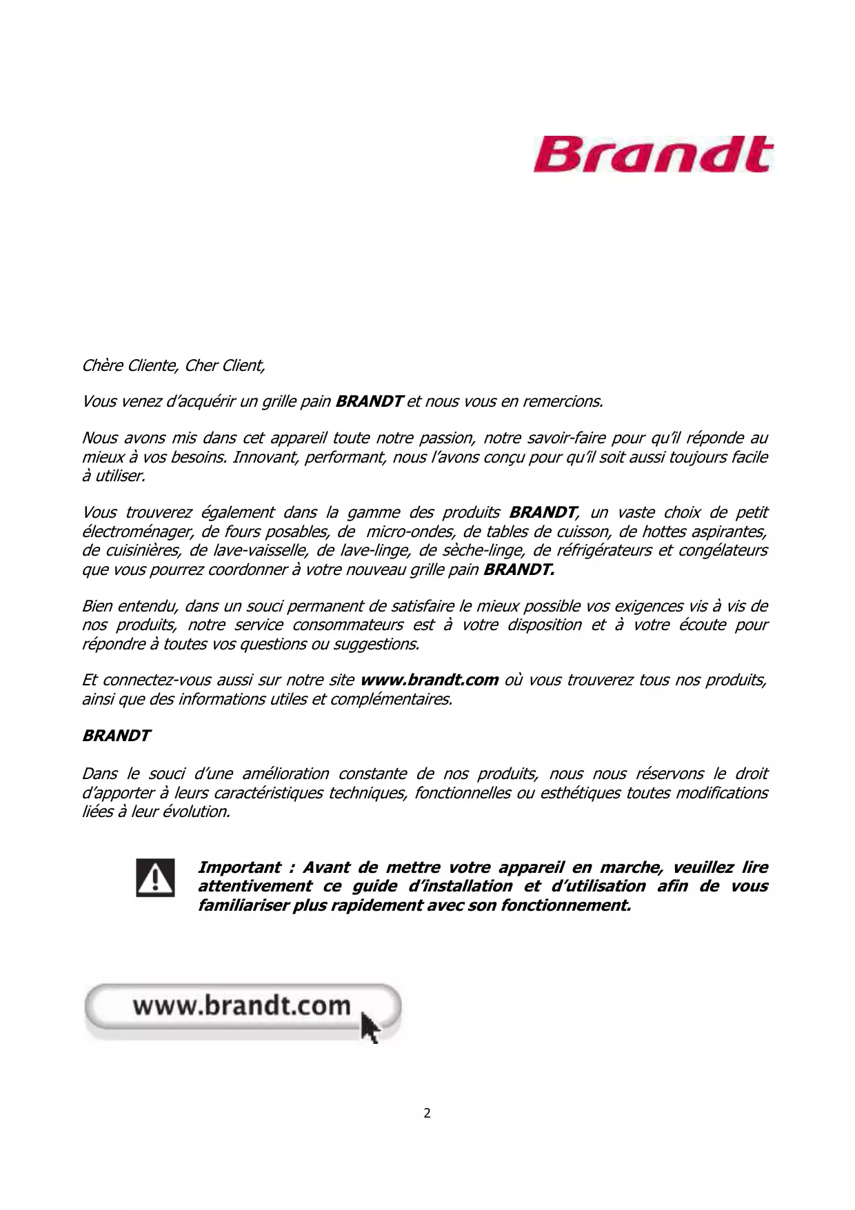 INSTRUCTION MANUAL Grille pain Toaster TO756 Chère Cliente, Cher Client, Vous venez d’acquérir un grille pain BRANDT et nous vous en remercions. Nous avons mis dans cet appareil toute notre passion, notre savoir-faire pour qu’il réponde au mieux à vos besoins. Innovant, performant, nous l’avons conçu pour qu’il soit aussi toujours facile à utiliser. Vous trouverez également dans la gamme des produits BRANDT, un vaste choix de petit électroménager, de fours posables, de micro-ondes, de tables de cuisson, de hottes aspirantes, de cuisinières, de lave-vaisselle, de lave-linge, de sèche-linge, de réfrigérateurs et congélateurs que vous pourrez coordonner à votre nouveau grille pain BRANDT. Bien entendu, dans un souci permanent de satisfaire le mieux possible vos exigences vis à vis de nos produits, notre service consommateurs est à votre disposition et à votre écoute pour répondre à toutes vos questions ou suggestions. Et connectez-vous aussi sur notre site www.brandt.com où vous trouverez tous nos produits, ainsi que des informations utiles et complémentaires. BRANDT Dans le souci d’une amélioration constante de nos produits, nous nous réservons le droit d’apporter à leurs caractéristiques techniques, fonctionnelles ou esthétiques toutes modifications liées à leur évolution. Important : Avant de mettre votre appareil en marche, veuillez lire attentivement ce guide d’installation et d’utilisation afin de vous familiariser plus rapidement avec son fonctionnement.