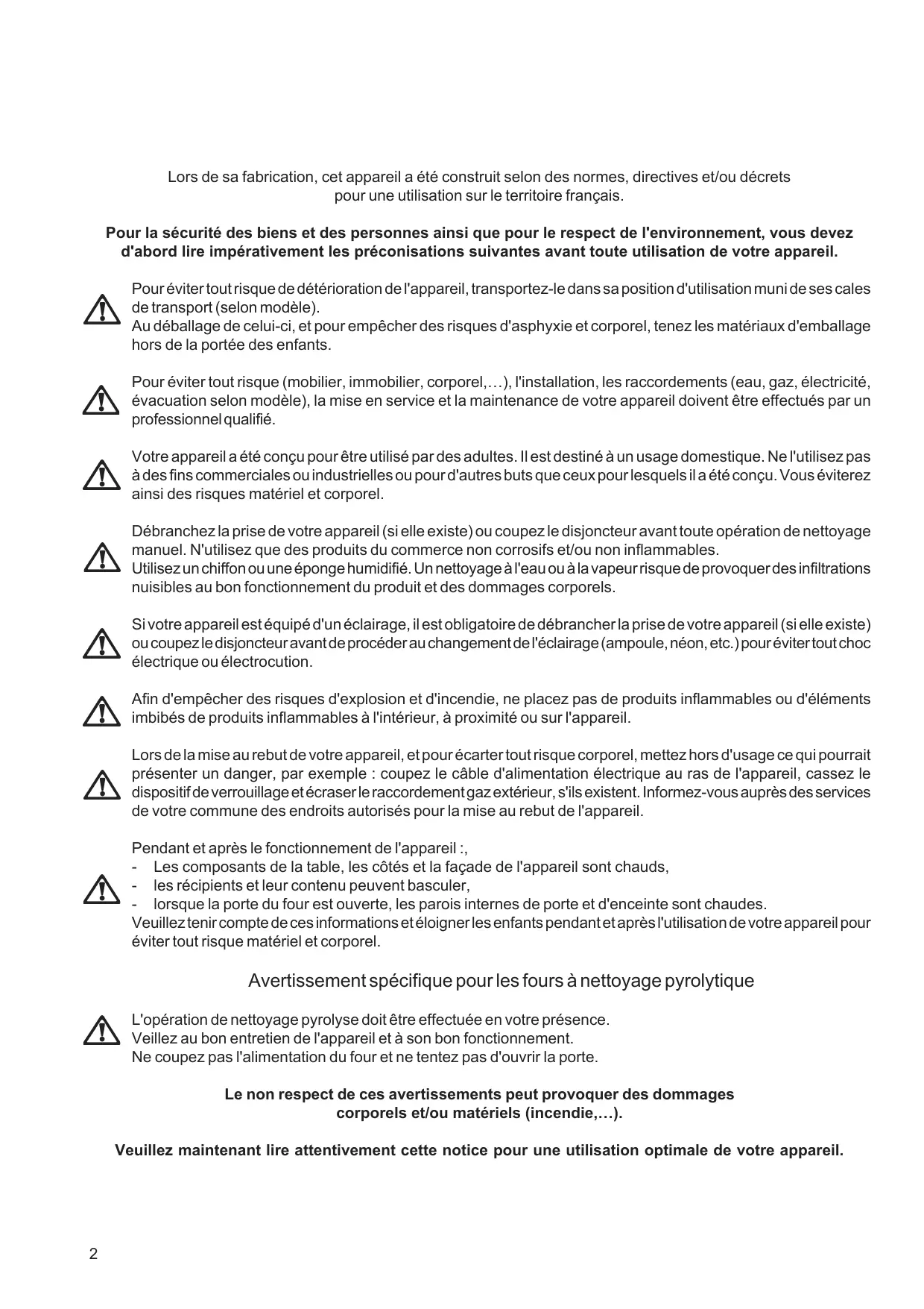 Lors de sa fabrication, cet appareil a été construit selon des normes, directives et/ou décrets pour une utilisation sur le territoire français. Pour la sécurité des biens et des personnes ainsi que pour le respect de l'environnement, vous devez d'abord lire impérativement les préconisations suivantes avant toute utilisation de votre appareil. Pour éviter tout risque de détérioration de l'appareil, transportez-le dans sa position d'utilisation muni de ses cales de transport (selon modèle). Au déballage de celui-ci, et pour empêcher des risques d'asphyxie et corporel, tenez les matériaux d'emballage hors de la portée des enfants. Pour éviter tout risque (mobilier, immobilier, corporel,…), l'installation, les raccordements (eau, gaz, électricité, évacuation selon modèle), la mise en service et la maintenance de votre appareil doivent être effectués par un professionnel qualifié. Votre appareil a été conçu pour être utilisé par des adultes. Il est destiné à un usage domestique. Ne l'utilisez pas à des fins commerciales ou industrielles ou pour d'autres buts que ceux pour lesquels il a été conçu. Vous éviterez ainsi des risques matériel et corporel. Débranchez la prise de votre appareil (si elle existe) ou coupez le disjoncteur avant toute opération de nettoyage manuel. N'utilisez que des produits du commerce non corrosifs et/ou non inflammables. Utilisez un chiffon ou une éponge humidifié. Un nettoyage à l'eau ou à la vapeur risque de provoquer des infiltrations nuisibles au bon fonctionnement du produit et des dommages corporels. Si votre appareil est équipé d'un éclairage, il est obligatoire de débrancher la prise de votre appareil (si elle existe) ou coupez le disjoncteur avant de procéder au changement de l'éclairage (ampoule, néon, etc.) pour éviter tout choc électrique ou électrocution. Afin d'empêcher des risques d'explosion et d'incendie, ne placez pas de produits inflammables ou d'éléments imbibés de produits inflammables à l'intérieur, à proximité ou sur l'appareil. Lors de la mise au rebut de votre appareil, et pour écarter tout risque corporel, mettez hors d'usage ce qui pourrait présenter un danger, par exemple : coupez le câble d'alimentation électrique au ras de l'appareil, cassez le dispositif de verrouillage et écraser le raccordement gaz extérieur, s'ils existent. Informez-vous auprès des services de votre commune des endroits autorisés pour la mise au rebut de l'appareil. Pendant et après le fonctionnement de l'appareil :, - Les composants de la table, les côtés et la façade de l'appareil sont chauds, - les récipients et leur contenu peuvent basculer, - lorsque la porte du four est ouverte, les parois internes de porte et d'enceinte sont chaudes. Veuillez tenir compte de ces informations et éloigner les enfants pendant et après l'utilisation de votre appareil pour éviter tout risque matériel et corporel.