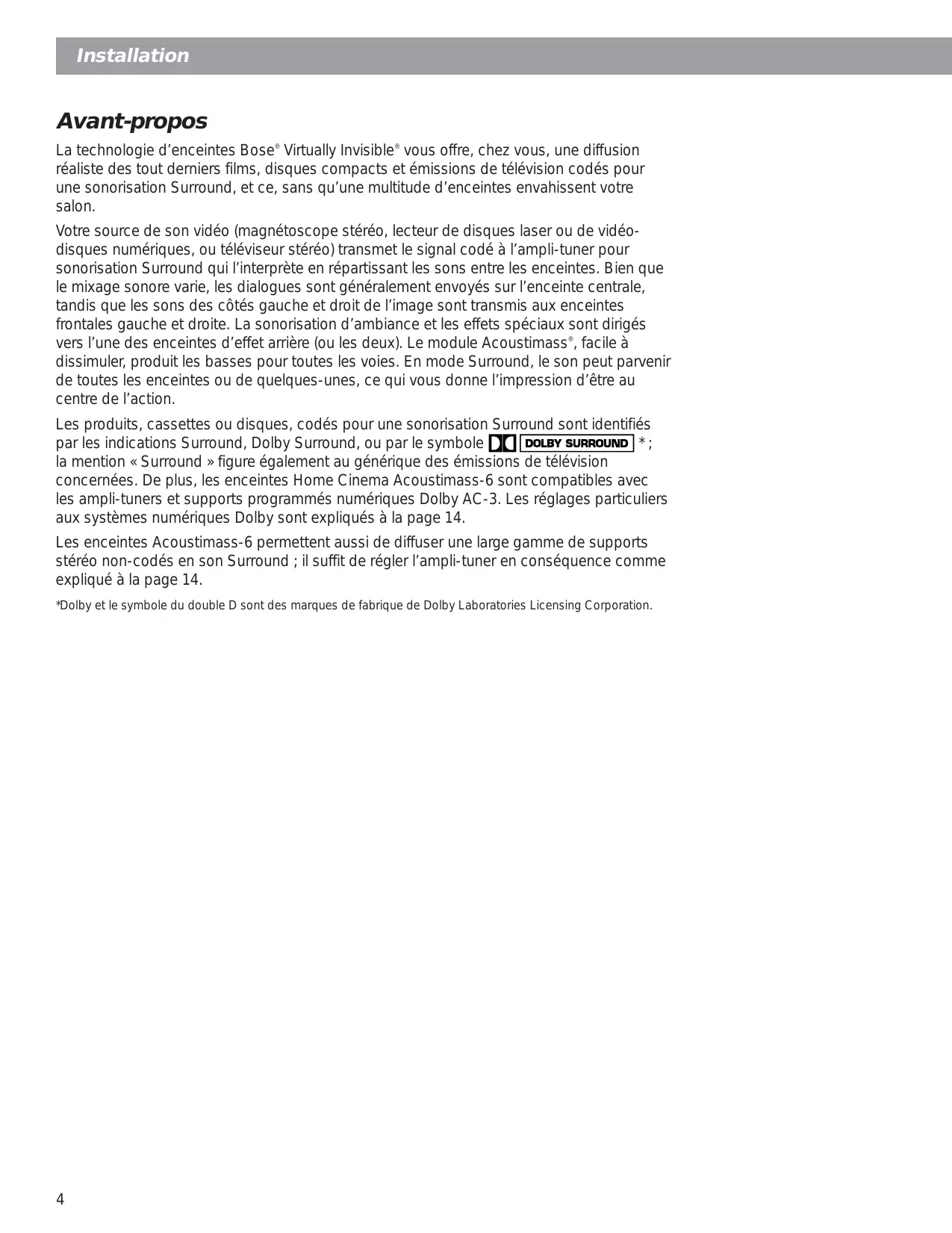 Les produits, cassettes ou disques, codés pour une sonorisation Surround sont identifiés par les indications Surround, Dolby Surround, ou par le symbole [DOLBY SURROUND]; la mention « Surround » figure également au générique des émissions de télévision concernées. De plus, les enceintes Home Cinema Acoustimass-6 sont compatibles avec les ampli-tuners et supports programmes numériques Dolby AC-3. Les réglages particuliers aux systèmes numériques Dolby sont expliqués à la page 14.