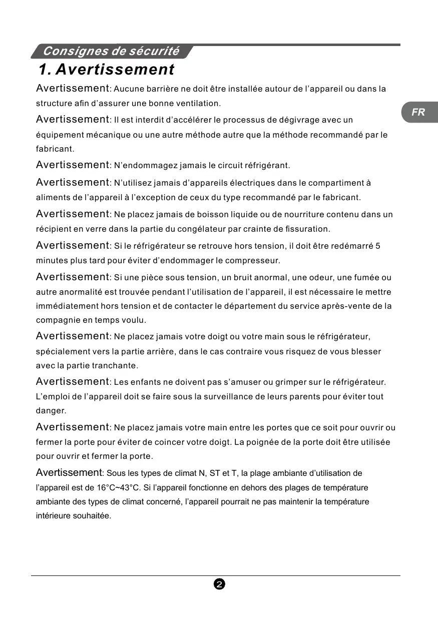 Avertissement: Sous les types de climat N, ST et T, la plage ambiante d’utilisation de l’appareil est de 16°C~43°C. Si l’appareil fonctionne en dehors des plages de température ambiante des types de climat concerné, l’appareil pourrait ne pas maintenir la température intérieure souhaitée.