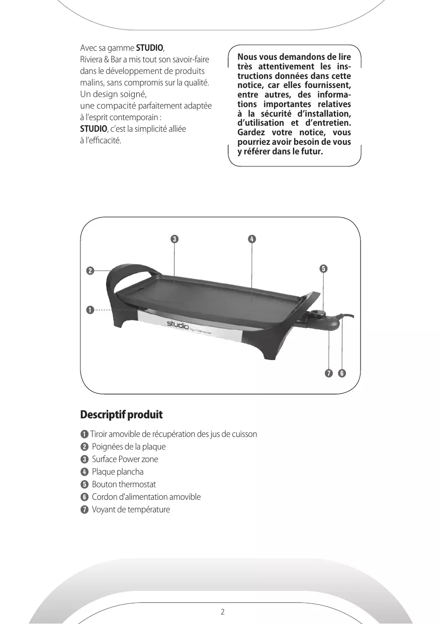 Plancha conviviale QC 416 A Instructions d’utilisation Avec sa gamme STUDIO, Riviera & Bar a mis tout son savoir-faire dans le développement de produits malins, sans compromis sur la qualité. Un design soigné, une compacité parfaitement adaptée à l’esprit contemporain : STUDIO, c’est la simplicité alliée à l’efficacité. Nous vous demandons de lire très attentivement les instructions données dans cette notice, car elles fournissent, entre autres, des informations importantes relatives à la sécurité d’installation, d’utilisation et d’entretien. Gardez votre notice, vous pourriez avoir besoin de vous y référer dans le futur.