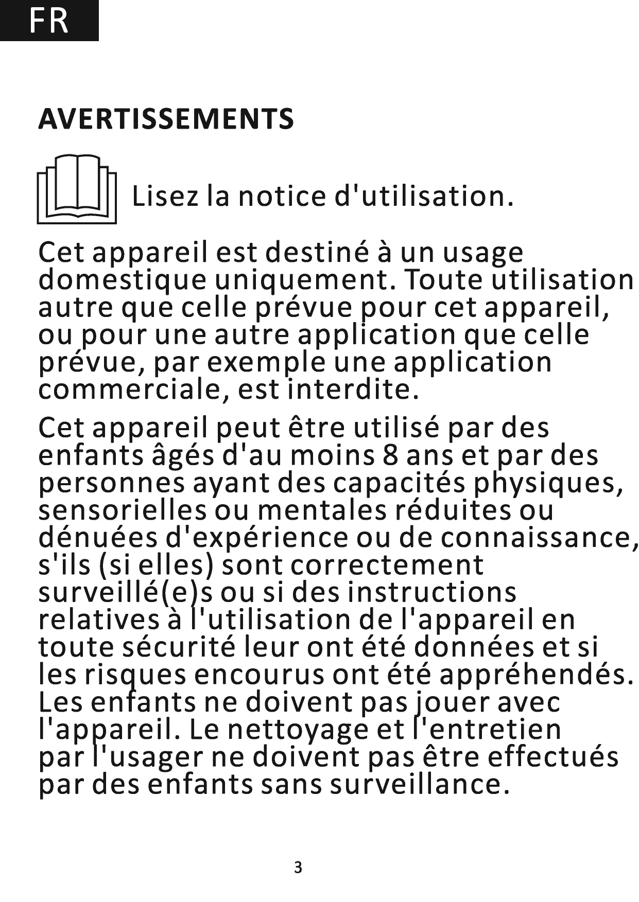 Lisez la notice d'utilisation. Cet appareil est destiné à un usage domestique uniquement. Toute utilisation autre que celle prévue pour cet appareil, ou pour une autre application que celle prévue, par exemple une application commerciale, est interdite. Cet appareil peut être utilisé par des enfants âgés d'au moins 8 ans et par des personnes ayant des capacités physiques, sensorielles ou mentales réduites ou dénuées d'expérience ou de connaissance, s'ils (si elles) sont correctement surveillé(e)s ou si des instructions relatives à l'utilisation de l'appareil en toute sécurité leur ont été données et si les risques encourus ont été appréhendés. Les enfants ne doivent pas jouer avec l'appareil. Le nettoyage et l'entretien par l'usager ne doivent pas être effectués par des enfants sans surveillance.