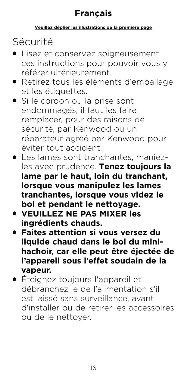 Français Veuillez déplier les illustrations de la première page Sécurité Lisez et conservez soigneusement ces instructions pour pouvoir vous y référer ultérieurement. O Retirez tous les éléments d’emballage et les étiquettes. O Si le cordon ou la prise sont endommagés, il faut les faire remplacer, pour des raisons de sécurité, par Kenwood ou un réparateur agréé par Kenwood pour éviter tout accident. O Les lames sont tranchantes, maniezles avec prudence. Tenez toujours la lame par le haut, loin du tranchant, lorsque vous manipulez les lames tranchantes, lorsque vous videz le bol et pendant le nettoyage. O VEUILLEZ NE PAS MIXER les ingrédients chauds. O Faites attention si vous versez du liquide chaud dans le bol du minihachoir, car elle peut être éjectée de l’appareil sous l’effet soudain de la vapeur. O Éteignez toujours l'appareil et débranchez le de l'alimentation s'il est laissé sans surveillance, avant d'installer ou de retirer les accessoires ou de le nettoyer.