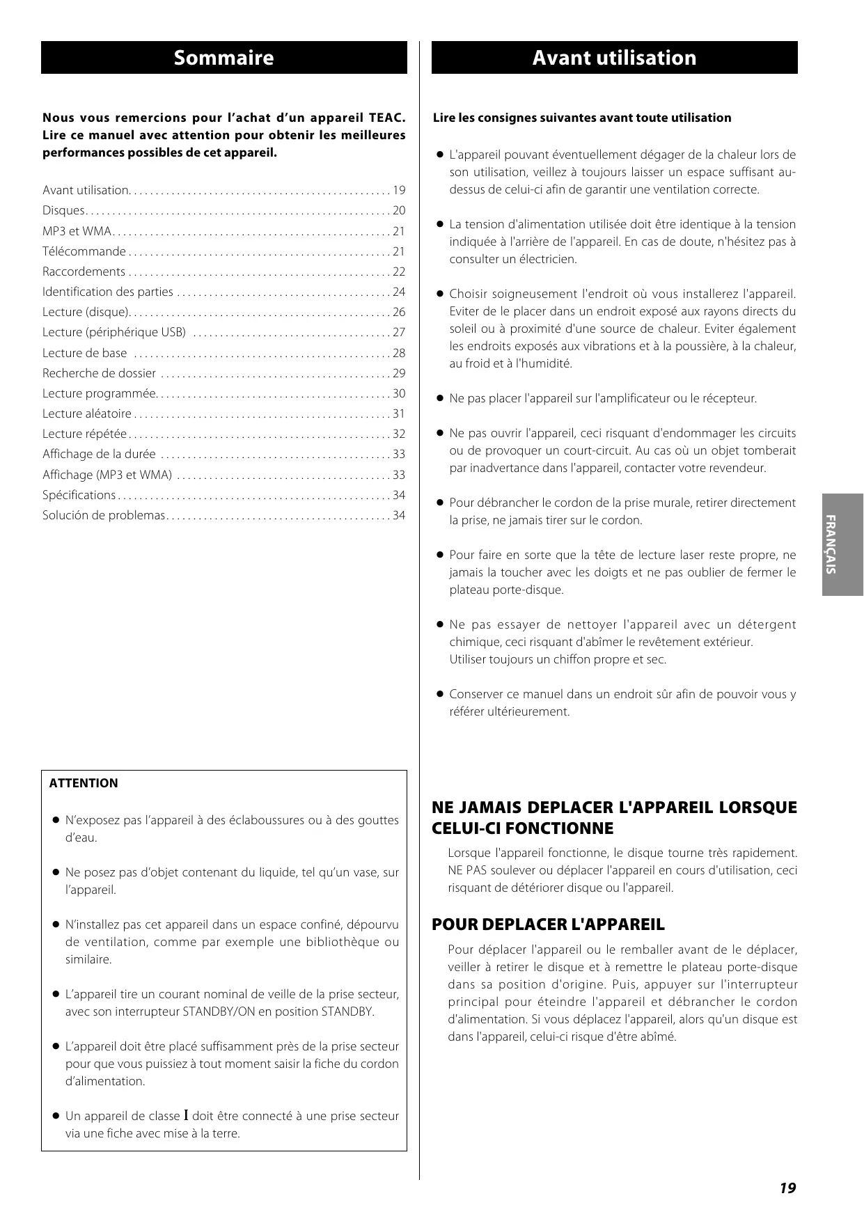 - ESPAÑOL Sommaire Nous vous remercions pour l’achat d’un appareil TEAC. Lire ce manuel avec attention pour obtenir les meilleures performances possibles de cet appareil. Avant utilisation p. 19