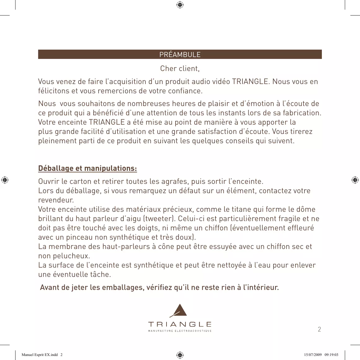 Vous venez de faire l'acquisition d'un produit audio video TRIANGLE. Nous vous en félicitons et vous remercions de votre confiance.