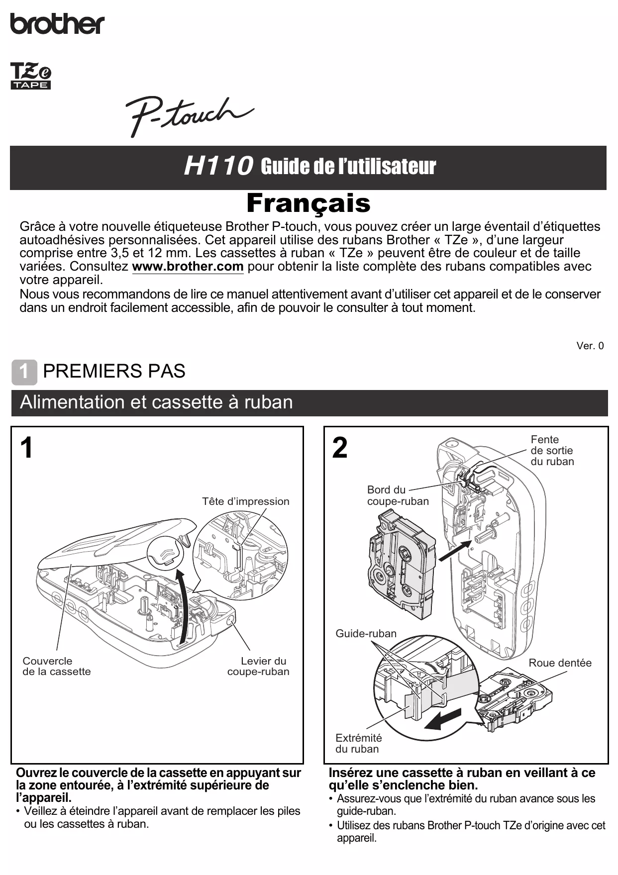 H110 Guide de l’utilisateur Français Grâce à votre nouvelle étiqueteuse Brother P-touch, vous pouvez créer un large éventail d’étiquettes autoadhésives personnalisées. Cet appareil utilise des rubans Brother « TZe », d’une largeur comprise entre 3,5 et 12 mm. Les cassettes à ruban « TZe » peuvent être de couleur et de taille variées. Consultez www.brother.com pour obtenir la liste complète des rubans compatibles avec votre appareil. Nous vous recommandons de lire ce manuel attentivement avant d’utiliser cet appareil et de le conserver dans un endroit facilement accessible, afin de pouvoir le consulter à tout moment. Ver. 0 1 PREMIERS PAS Alimentation et cassette à ruban