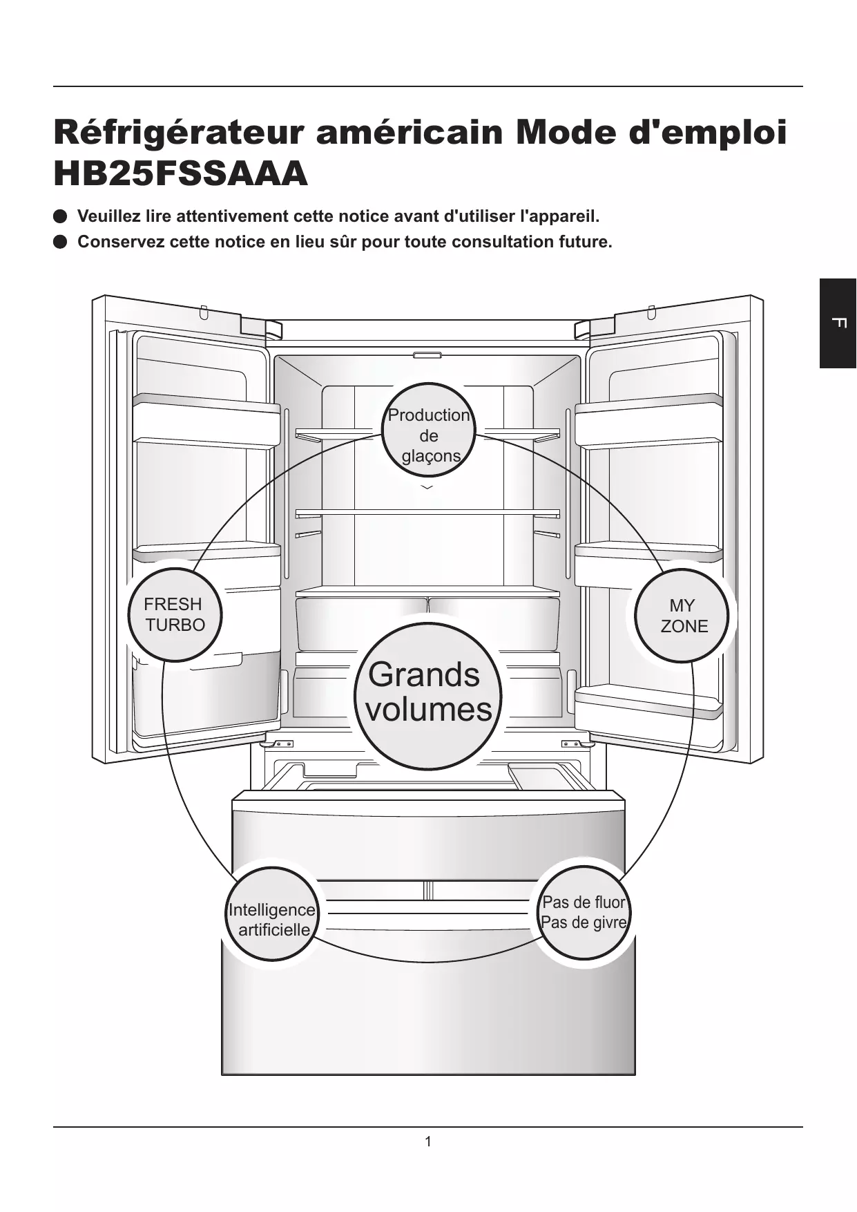 Réfrigérateur américain Mode d'emploi HB25FSSAAA Veuillez lire attentivement cette notice avant d'utiliser l'appareil. Conservez cette notice en lieu sûr pour toute consultation future.