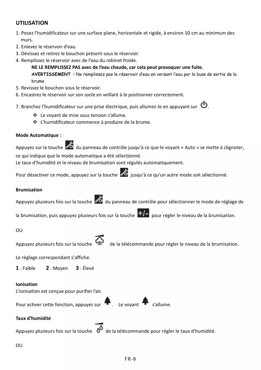 FR-9 Appuyez plusieurs fois sur la touche du panneau de contrôle pour sélectionner le mode de réglage de l'humidification, puis appuyez plusieurs fois sur la touche pour régler le taux d’humidité. Vous pouvez régler le taux d’humidité relative entre 45% et 90% par incrément de 5%. Quand le taux d’humidité de la pièce est égal ou supérieur à celui que vous avez sélectionné, l’humidificateur ne produit pas de brume. Minuterie La minuterie permet de paramétrer une durée de fonctionnement de l'humidificateur avant son extinction automatique. Pour régler le délai d’extinction automatiquement, appuyez plusieurs fois sur la touche télécommande jusqu‘à ce que la durée désirée soit sélectionnée. de la