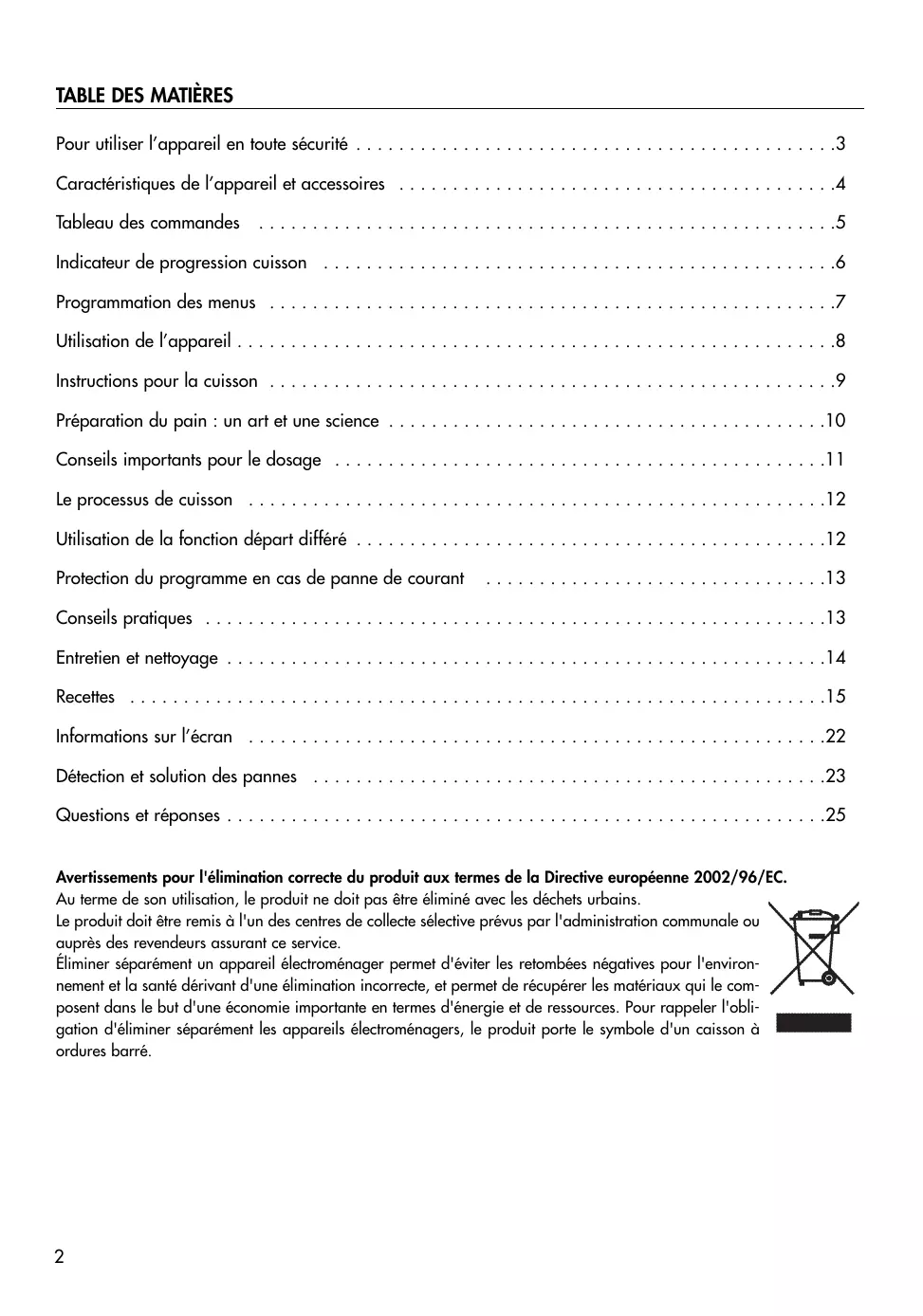 • Questions et réponses Avertissements pour l'élimination correcte du produit aux termes de la Directive européenne 2002/96/EC. Au terme de son utilisation, le produit ne doit pas être éliminé avec les déchets urbains. Le produit doit être remis à l'un des centres de collecte sélective prévus par l'administration communale ou auprès des revendeurs assurant ce service. Éliminer séparément un appareil électroménager permet d'éviter les retombées négatives pour l'environnement et la santé dérivant d'une élimination incorrecte, et permet de récupérer les matériaux qui le composent dans le but d'une économie importante en termes d'énergie et de ressources. Pour rappeler l'obligation d'éliminer séparément les appareils électroménagers, le produit porte le symbole d'un caisson à ordures barré. p. 25