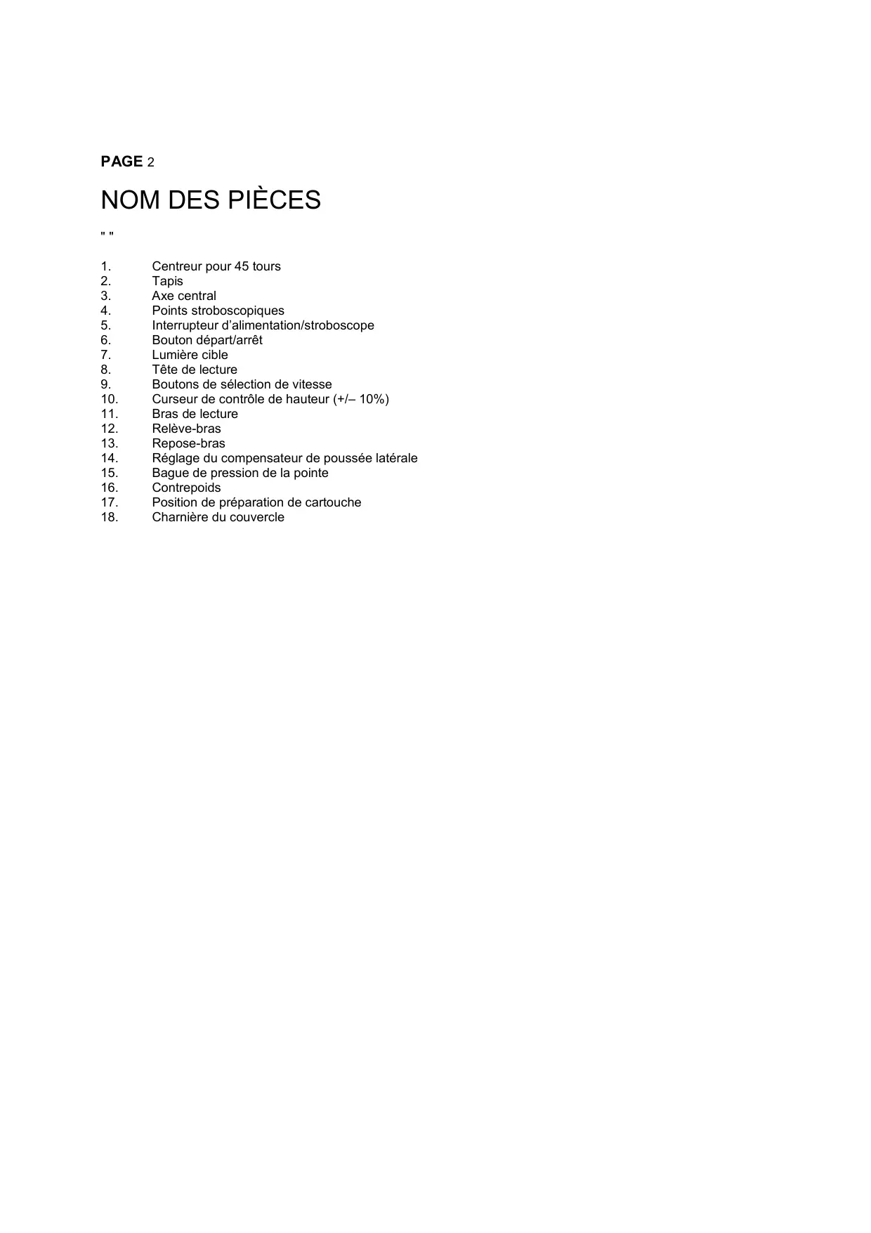 Centreur pour 45 tours Tapis Axe central Points stroboscopiques Interrupteur d’alimentation/stroboscope Bouton départ/arrêt Lumière cible Tête de lecture Boutons de sélection de vitesse Curseur de contrôle de hauteur (+/– 10%) Bras de lecture Relève-bras Repose-bras Réglage du compensateur de poussée latérale Bague de pression de la pointe Contrepoids Position de préparation de cartouche Charnière du couvercle PAGE 3 MONTAGE