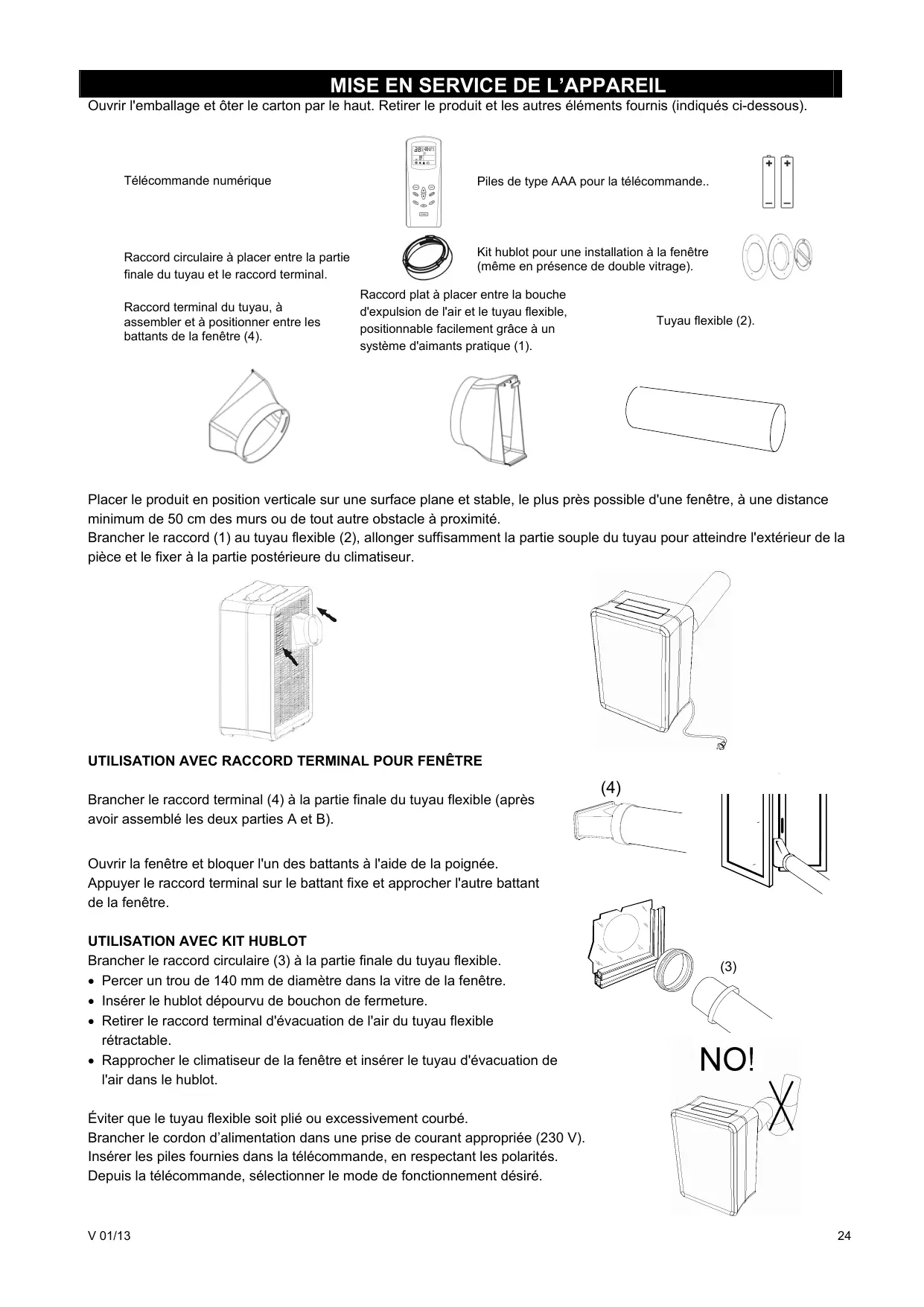 Brancher le raccord circulaire (3) à la partie finale du tuyau flexible. Percer un trou de 140 mm de diamètre dans la vitre de la fenêtre. Insérer le hublot dépourvu de bouchon de fermeture. Retirer le raccord terminal d'évacuation de l'air du tuyau flexible rétractable. Rapprocher le climatiseur de la fenêtre et insérer le tuyau d'évacuation de l'air dans le hublot. (3) Éviter que le tuyau flexible soit plié ou excessivement courbé. Brancher le cordon d’alimentation dans une prise de courant appropriée (230 V). Insérer les piles fournies dans la télécommande, en respectant les polarités. Depuis la télécommande, sélectionner le mode de fonctionnement désiré. V 01/13