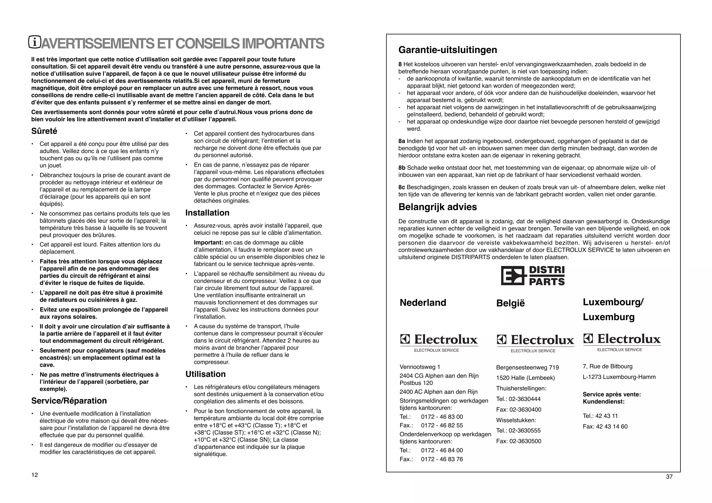 Cet appareil a ŽtŽ con•u de mani•re selle que la sŽcuritŽ en soit garantie. Des rŽparations inappropriŽes peuvent toutefois mettre ceste sŽcuritŽ en danger. Pour obtenir ceste sŽcuritŽ et pour prŽvenir Žgalement tous dommages Žventuels, il est conseillŽ de faire exŽcuter les rŽparations exclusivement par des personnes qui poss•dent les qualifications professionnelles requises. Nous vous conseillons de faire exŽcuter vos reparations et/ou vos vŽrifications par votre vendeur ou par le SERVICE ELGROEP et de nÕexiger que des pi•ces DISTRIPARTS dÕorigine.