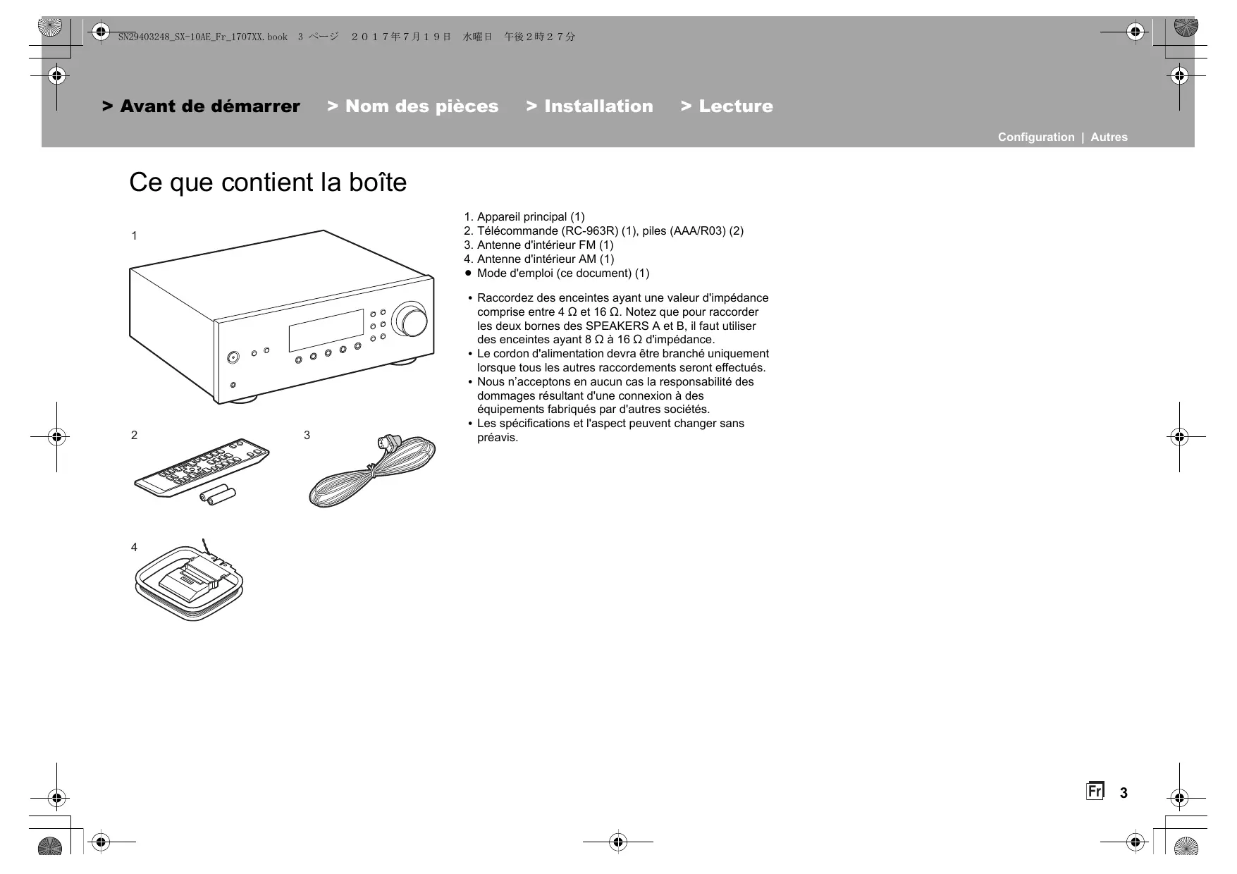 Appareil principal (1) Télécommande (RC-963R) (1), piles (AAA/R03) (2) Antenne d'intérieur FM (1) Antenne d'intérieur AM (1) Mode d'emploi (ce document) (1)