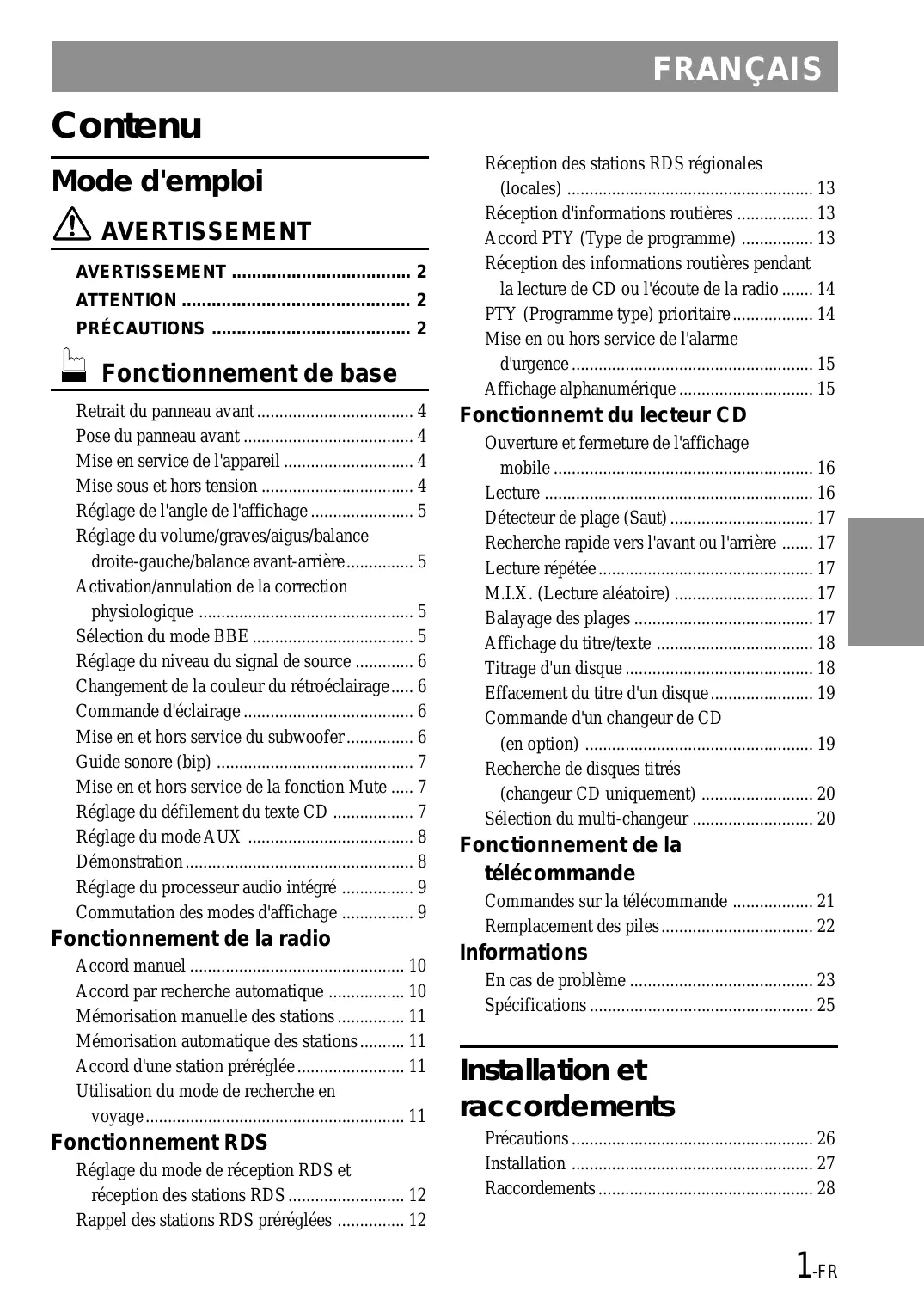 • FRANÇAIS Contenu Mode d'emploi AVERTISSEMENT AVERTISSEMENT p. 2