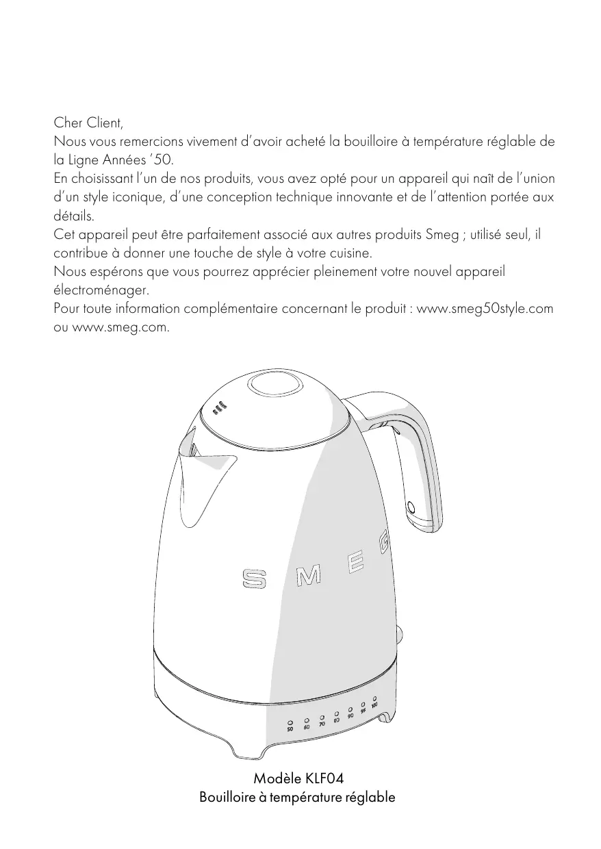 Cher Client, Nous vous remercions vivement d’avoir acheté la bouilloire à température réglable de la Ligne Années ’50. En choisissant l’un de nos produits, vous avez opté pour un appareil qui naît de l’union d’un style iconique, d’une conception technique innovante et de l’attention portée aux détails. Cet appareil peut être parfaitement associé aux autres produits Smeg ; utilisé seul, il contribue à donner une touche de style à votre cuisine. Nous espérons que vous pourrez apprécier pleinement votre nouvel appareil électroménager. Pour toute information complémentaire concernant le produit : www.smeg50style.com ou www.smeg.com. Modèle KLF04 Bouilloire à température réglable Sommaire