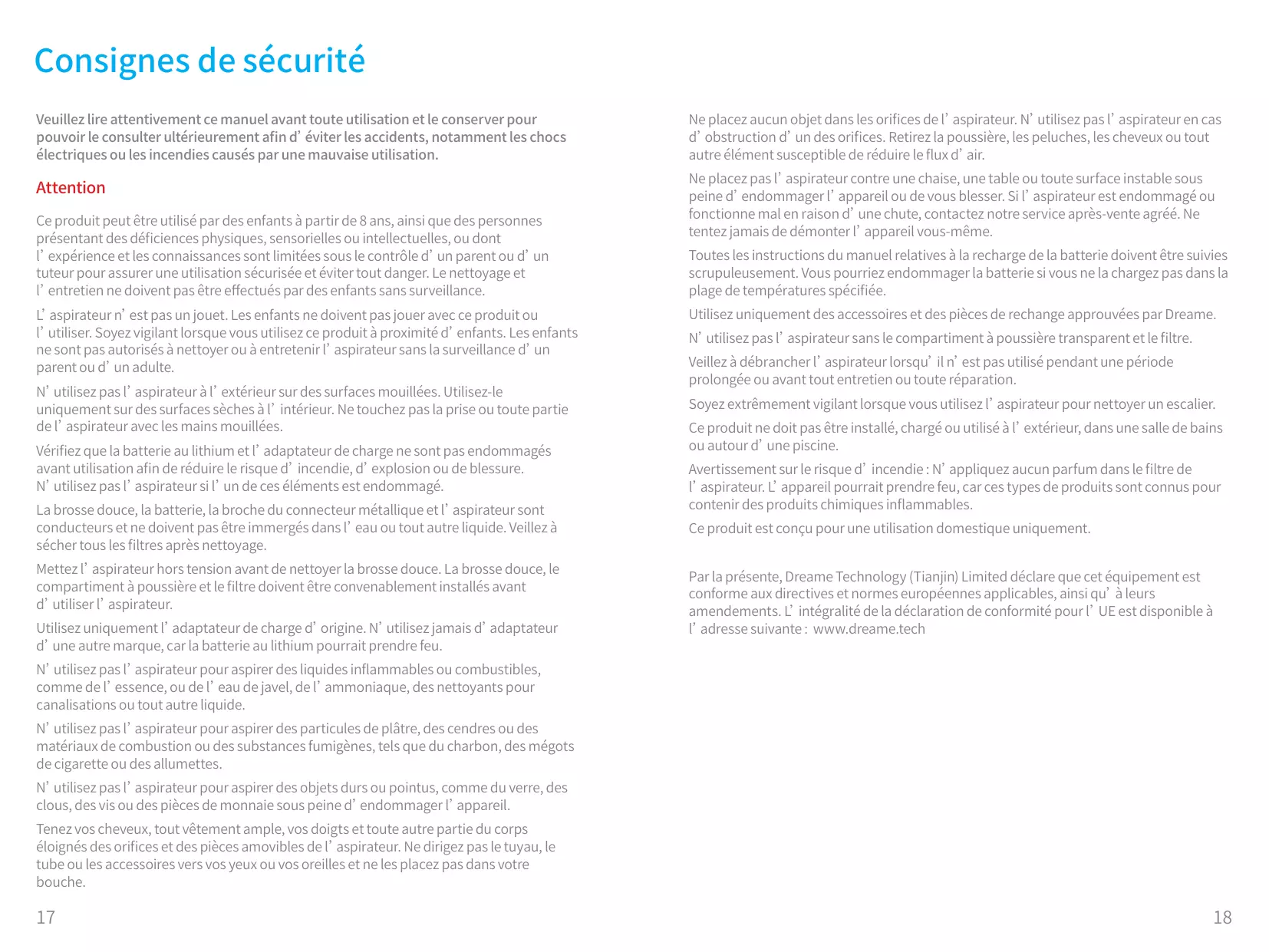 Consignes de sécurité Veuillez lire attentivement ce manuel avant toute utilisation et le conserver pour pouvoir le consulter ultérieurement afin d’éviter les accidents, notamment les chocs électriques ou les incendies causés par une mauvaise utilisation. Attention Ce produit peut être utilisé par des enfants à partir de 8 ans, ainsi que des personnes présentant des déficiences physiques, sensorielles ou intellectuelles, ou dont l’expérience et les connaissances sont limitées sous le contrôle d’un parent ou d’un tuteur pour assurer une utilisation sécurisée et éviter tout danger. Le nettoyage et l’entretien ne doivent pas être effectués par des enfants sans surveillance. L’aspirateur n’est pas un jouet. Les enfants ne doivent pas jouer avec ce produit ou l’utiliser. Soyez vigilant lorsque vous utilisez ce produit à proximité d’enfants. Les enfants ne sont pas autorisés à nettoyer ou à entretenir l’aspirateur sans la surveillance d’un parent ou d’un adulte. N’utilisez pas l’aspirateur à l’extérieur sur des surfaces mouillées. Utilisez-le uniquement sur des surfaces sèches à l’intérieur. Ne touchez pas la prise ou toute partie de l’aspirateur avec les mains mouillées. Vérifiez que la batterie au lithium et l’adaptateur de charge ne sont pas endommagés avant utilisation afin de réduire le risque d’incendie, d’explosion ou de blessure. N’utilisez pas l’aspirateur si l’un de ces éléments est endommagé. La brosse douce, la batterie, la broche du connecteur métallique et l’aspirateur sont conducteurs et ne doivent pas être immergés dans l’eau ou tout autre liquide. Veillez à sécher tous les filtres après nettoyage. Mettez l’aspirateur hors tension avant de nettoyer la brosse douce. La brosse douce, le compartiment à poussière et le filtre doivent être convenablement installés avant d’utiliser l’aspirateur. Utilisez uniquement l’adaptateur de charge d’origine. N’utilisez jamais d’adaptateur d’une autre marque, car la batterie au lithium pourrait prendre feu. Ne placez aucun objet dans les orifices de l’aspirateur. N’utilisez pas l’aspirateur en cas d’obstruction d’un des orifices. Retirez la poussière, les peluches, les cheveux ou tout autre élément susceptible de réduire le flux d’air. Ne placez pas l’aspirateur contre une chaise, une table ou toute surface instable sous peine d’endommager l’appareil ou de vous blesser. Si l’aspirateur est endommagé ou fonctionne mal en raison d’une chute, contactez notre service après-vente agréé. Ne tentez jamais de démonter l’appareil vous-même. Toutes les instructions du manuel relatives à la recharge de la batterie doivent être suivies scrupuleusement. Vous pourriez endommager la batterie si vous ne la chargez pas dans la plage de températures spécifiée. Utilisez uniquement des accessoires et des pièces de rechange approuvées par Dreame. N’utilisez pas l’aspirateur sans le compartiment à poussière transparent et le filtre. Veillez à débrancher l’aspirateur lorsqu’il n’est pas utilisé pendant une période prolongée ou avant tout entretien ou toute réparation. Soyez extrêmement vigilant lorsque vous utilisez l’aspirateur pour nettoyer un escalier. Ce produit ne doit pas être installé, chargé ou utilisé à l’extérieur, dans une salle de bains ou autour d’une piscine. Avertissement sur le risque d’incendie : N’appliquez aucun parfum dans le filtre de l’aspirateur. L’appareil pourrait prendre feu, car ces types de produits sont connus pour contenir des produits chimiques inflammables. Ce produit est conçu pour une utilisation domestique uniquement. Par la présente, Dreame Technology (Tianjin) Limited déclare que cet équipement est conforme aux directives et normes européennes applicables, ainsi qu’à leurs amendements. L’intégralité de la déclaration de conformité pour l’UE est disponible à l’adresse suivante : www.dreame.tech N’utilisez pas l’aspirateur pour aspirer des liquides inflammables ou combustibles, comme de l’essence, ou de l’eau de javel, de l’ammoniaque, des nettoyants pour canalisations ou tout autre liquide. N’utilisez pas l’aspirateur pour aspirer des particules de plâtre, des cendres ou des matériaux de combustion ou des substances fumigènes, tels que du charbon, des mégots de cigarette ou des allumettes. N’utilisez pas l’aspirateur pour aspirer des objets durs ou pointus, comme du verre, des clous, des vis ou des pièces de monnaie sous peine d’endommager l’appareil. Tenez vos cheveux, tout vêtement ample, vos doigts et toute autre partie du corps éloignés des orifices et des pièces amovibles de l’aspirateur. Ne dirigez pas le tuyau, le tube ou les accessoires vers vos yeux ou vos oreilles et ne les placez pas dans votre bouche.
