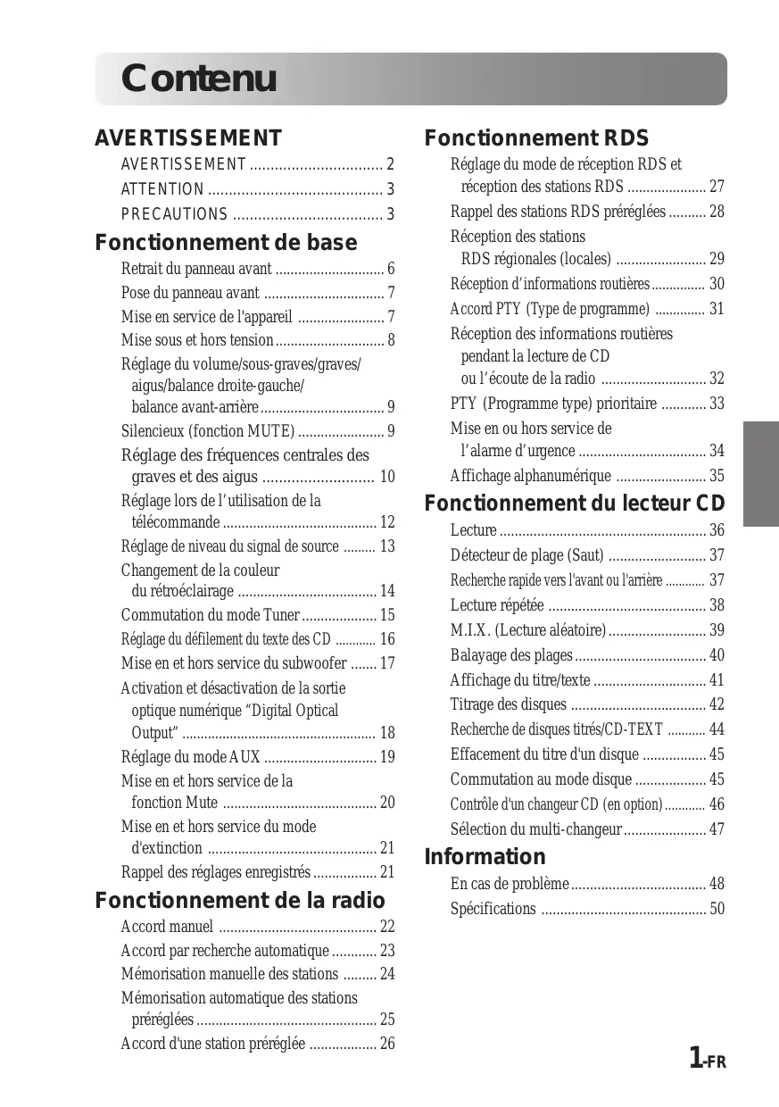 - BEDIENUNGSANLEITUNG Lesen Sie diese Bedienungsanleitung bitte vor Gebrauch des Gerätes. Contenu AVERTISSEMENT AVERTISSEMENT ................................ 2 ATTENTION .......................................... 3 PRECAUTIONS .................................... 3 Fonctionnement de base Retrait du panneau avant ............................. 6 Pose du panneau avant ................................ 7 Mise en service de l'appareil ....................... 7 Mise sous et hors tension ............................. 8 Réglage du volume/sous-graves/graves/ aigus/balance droite-gauche/ balance avant-arrière ................................. 9 Silencieux (fonction MUTE) ....................... 9 Réglage des fréquences centrales des graves et des aigus ........................... 10 Réglage lors de l’utilisation de la télécommande ......................................... 12 Réglage de niveau du signal de source ......... 13 Changement de la couleur du rétroéclairage ..................................... 14 Commutation du mode Tuner .................... 15 Réglage du défilement du texte des CD ............ 16 Mise en et hors service du subwoofer ....... 17 Activation et désactivation de la sortie optique numérique “Digital Optical Output” ..................................................... 18 Réglage du mode AUX .............................. 19 Mise en et hors service de la fonction Mute ......................................... 20 Mise en et hors service du mode d'extinction ............................................. 21 Rappel des réglages enregistrés ................. 21 Fonctionnement de la radio Accord manuel .......................................... 22 Accord par recherche automatique ............ 23 Mémorisation manuelle des stations ......... 24 Mémorisation automatique des stations préréglées ................................................ 25 Accord d'une station préréglée .................. 26 Fonctionnement RDS Réglage du mode de réception RDS et réception des stations RDS ..................... 27 Rappel des stations RDS préréglées .......... 28 Réception des stations RDS régionales (locales) ........................ 29 Réception d’informations routières ............... 30 Accord PTY (Type de programme) .............. 31 Réception des informations routières pendant la lecture de CD ou l’écoute de la radio ............................ 32 PTY (Programme type) prioritaire ............ 33 Mise en ou hors service de l’alarme d’urgence .................................. 34 Affichage alphanumérique ........................ 35 Fonctionnement du lecteur CD Lecture ....................................................... 36 Détecteur de plage (Saut) .......................... 37 Recherche rapide vers l'avant ou l'arrière ............ 37 Lecture répétée .......................................... 38 M.I.X. (Lecture aléatoire) .......................... 39 Balayage des plages ................................... 40 Affichage du titre/texte .............................. 41 Titrage des disques .................................... 42 Recherche de disques titrés/CD-TEXT ........... 44 Effacement du titre d'un disque ................. 45 Commutation au mode disque ................... 45 Contrôle d'un changeur CD (en option) ............ 46 Sélection du multi-changeur ...................... 47 Information En cas de problème .................................... 48 Spécifications ............................................ 50 1-FR AVERTISSEMENT AVERTISSEMENT Ce symbole désigne des instructions importantes. Le non-respect de ces instructions peut entraîner de graves blessures, voire la mort.