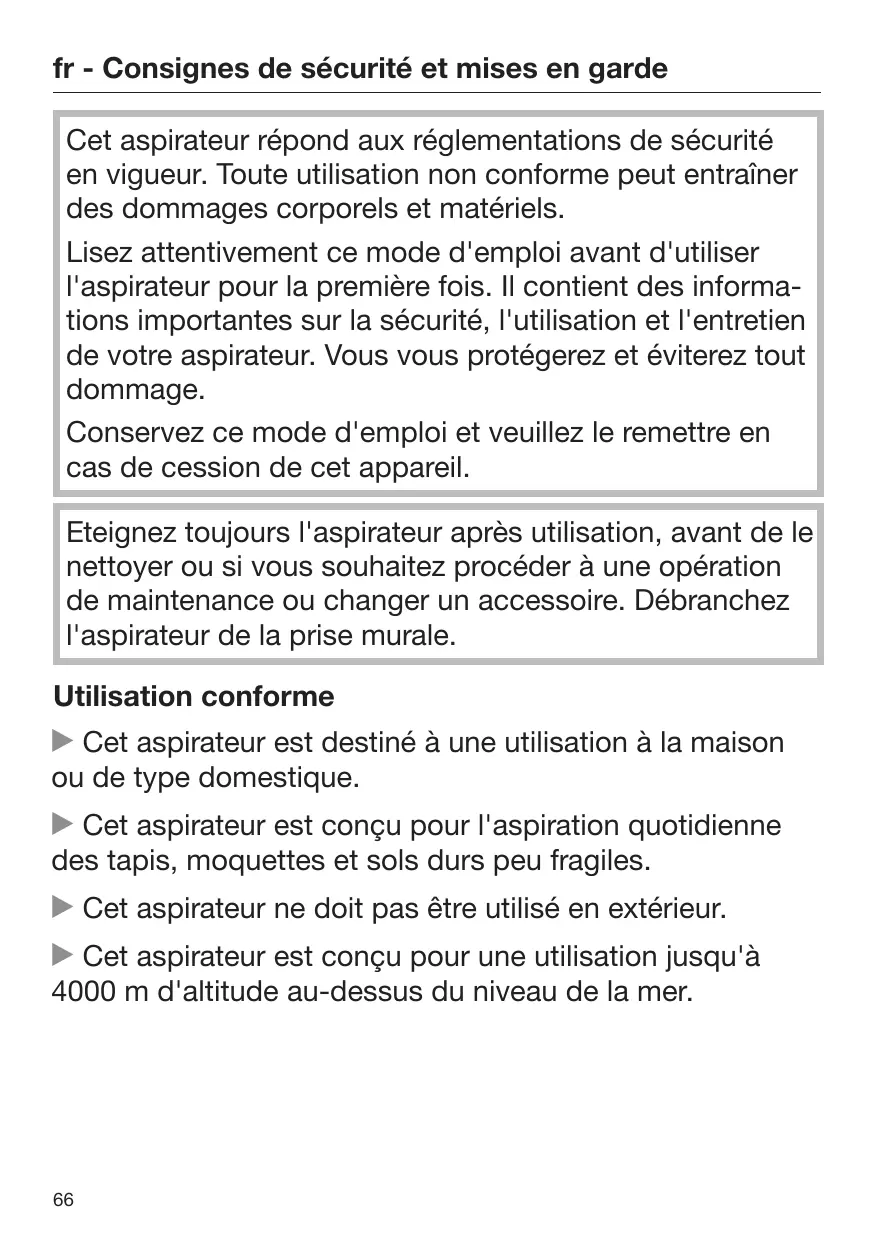 N'utilisez l'aspirateur que dans le cadre domestique, pour aspirer des poussières sèches. N'utilisez pas cet aspirateur sur les hommes et les animaux. Toute autre application, adaptation ou modification de l'aspirateur est interdite.
