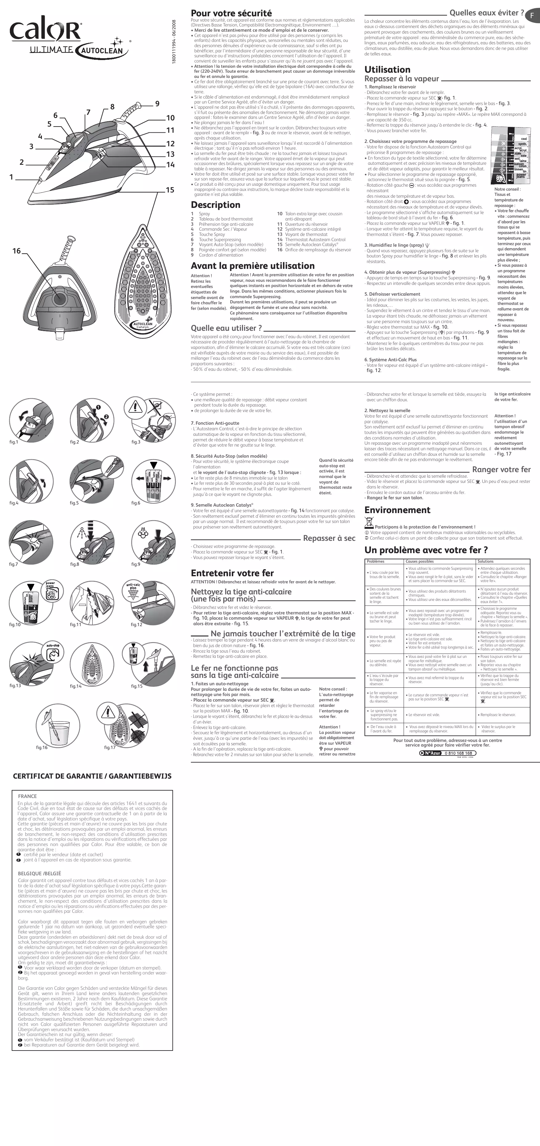 FRANCE En plus de la garantie légale qui découle des articles 1641 et suivants du Code Civil, due en tout état de cause sur des défauts et vices cachés de l’appareil, Calor assure une garantie contractuelle de 1 an à partir de la date d’achat, sauf législation spécifique à votre pays. Cette garantie (pièces et main d’œuvre) ne couvre pas les bris par chute et choc, les détériorations provoquées par un emploi anormal, les erreurs de branchement, le non-respect des conditions d’utilisation prescrites dans la notice d’emploi ou les réparations ou vérifications effectuées par des personnes non qualifiées par Calor. Pour être valable, ce bon de garantie doit être : 1 certifié par le vendeur (date et cachet) 2 joint à l’appareil en cas de réparation sous garantie. BELGIQUE /BELGIË Calor garantit cet appareil contre tous défauts et vices cachés 1 an à partir de la date d’achat sauf législation spécifique à votre pays.Cette garantie (pièces et main d’œuvre) ne couvre pas les bris par chute et choc, les détériorations provoquées par un emploi anormal, les erreurs de branchement, le non-respect des conditions d’utilisation prescrites dans la notice d’emploi ou les réparations ou vérifications effectuées par des personnes non qualifiées par Calor. Calor waarborgt dit apparaat tegen alle fouten en verborgen gebreken gedurende 1 jaar na datum van aankoop, uit gezonderd eventuelle specifieke wetgeving in uw land. Deze garantie (onderdelen en arbeidslonen) dekt niet de breuk door val of schok, beschadigingen veroorzaakt door abnormaal gebruik, vergissingen bij de elektrische aansluitingen, het niet-naleven van de gebruiksvoorwaarden voorgeschreven in de gebruiksaanwijzing en de herstellingen of het nazicht uitgevoerd door andere personen dan deze erkend door Calor. Om geldig te zijn, moet dit garantiebewijs : 1 Voor waar verklaard worden door de verkoper (datum en stempel). 2 Bij het apparaat gevoegd worden in geval van herstelling onder waarborg. Die Garantie von Calor gegen Schäden und versteckte Mängel für dieses Gerät gilt, wenn in Ihrem Land keine anders lautenden gesetzlichen Bestimmungen existieren, 2 Jahre nach dem Kaufdatum. Diese Garantie (Ersatzteile und Arbeit) greift nicht bei Beschädigungen durch Herunterfallen und Stöße sowie für Schäden, die durch unsachgemäßen Gebrauch, falschen Anschluss oder die Nichteinhaltung der in der Gebrauchsanweisung beschriebenen Nutzungsbedingungen sowie durch nicht von Calor qualifizierten Personen ausgeführte Reparaturen und Überprüfungen verursacht wurden. Der Garantieschein ist nur gültig, wenn dieser: 1 vom Verkäufer bestätigt ist (Kaufdatum und Stempel) 2 bei Reparaturen auf Garantie dem Gerät beigelegt wird. . Un peu d’eau peut rester Environnement ATTENTION ! Débranchez et laissez refroidir votre fer avant de le nettoyer. fig.12 - Fig. 17 Problèmes fig.9 fig.11 Attention ! l’utilisation d’un tampon abrasif endommage le revêtement autonettoyant de votre semelle Un problème avec votre fer ? Entretenir votre fer fig.10 la tige anticalcaire de votre fer.