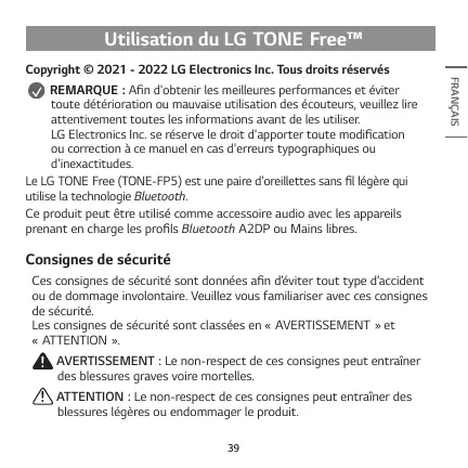 Le LG TONE Free (TONE-FP5) est une paire d'oreillettes sans fil légère qui utilise la technologie Bluetooth. Ce produit peut être utilisé comme accessoire audio avec les appareils prenant en charge les profils Bluetooth A2DP ou Mains libres.