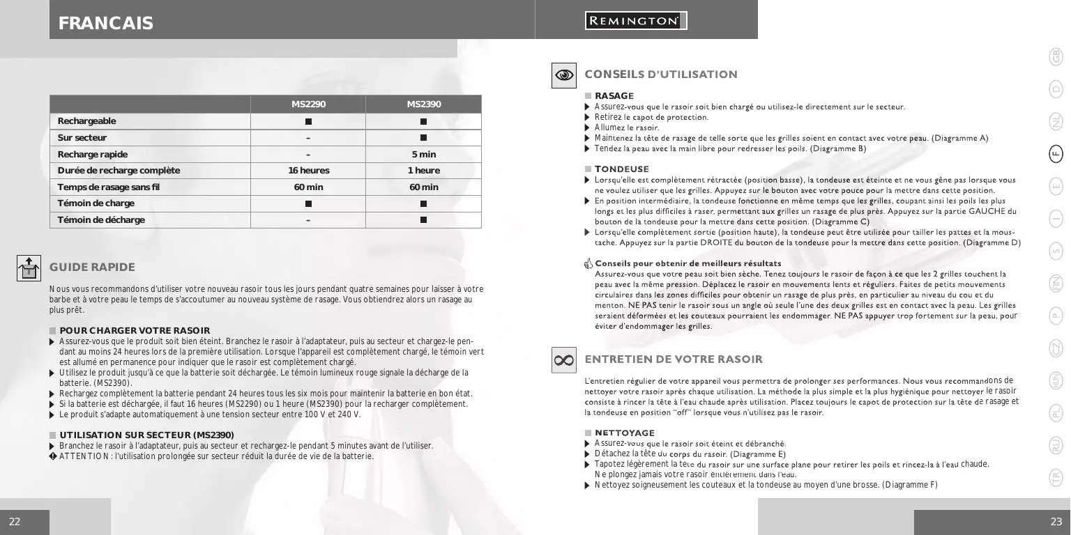 FRANCAIS MS2290 MS2390 Rechargeable Sur secteur Recharge rapide Durée de recharge complète Temps de rasage sans fi l