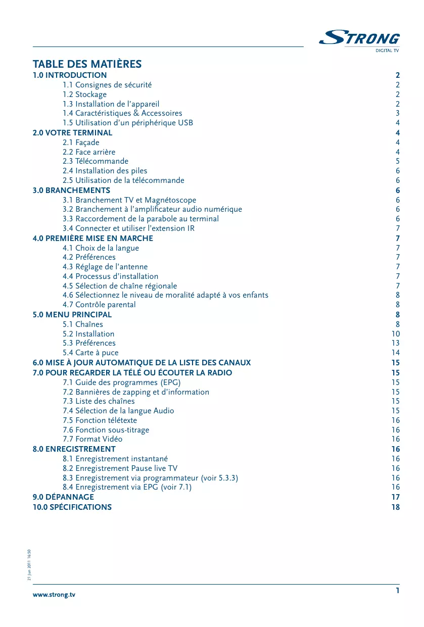 Le produit est conforme aux exigences de base et aux autres dispositions et directives applicables CE 2004/108/EEC y 73/23EEC RoHS 2002/95EEC Le terminal est conforme à la norme EN 60065. Sujet à modification. En conséquence de la recherche et du développement continus, les spécificités techniques, le design et l’apparence du produit peuvent changer. ASTRA est une marque déposée de SES ASTRA, TNTSAT est CANAL READY sont des marques de GROUPE CANAL+, Viaccess est une marque de Viaccess, tous les autres produits ou marques sont des marques déposées de leurs propriétaires respectifs. © STRONG 2011. Tous droits réservés. 04/2011 Produit exclusivement destiné à la vente en France métropolitaine, Corse comprise pour une exploitation en France métropolitaine, Corse comprise. www.tntsat.tv