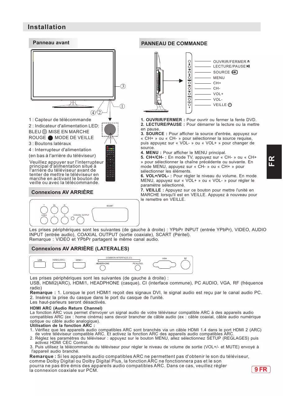USB, HDMI2(ARC), HDMI1, HEADPHONE (casque), CI (interface commune), PC AUDIO, VGA, RF (fréquence radio)