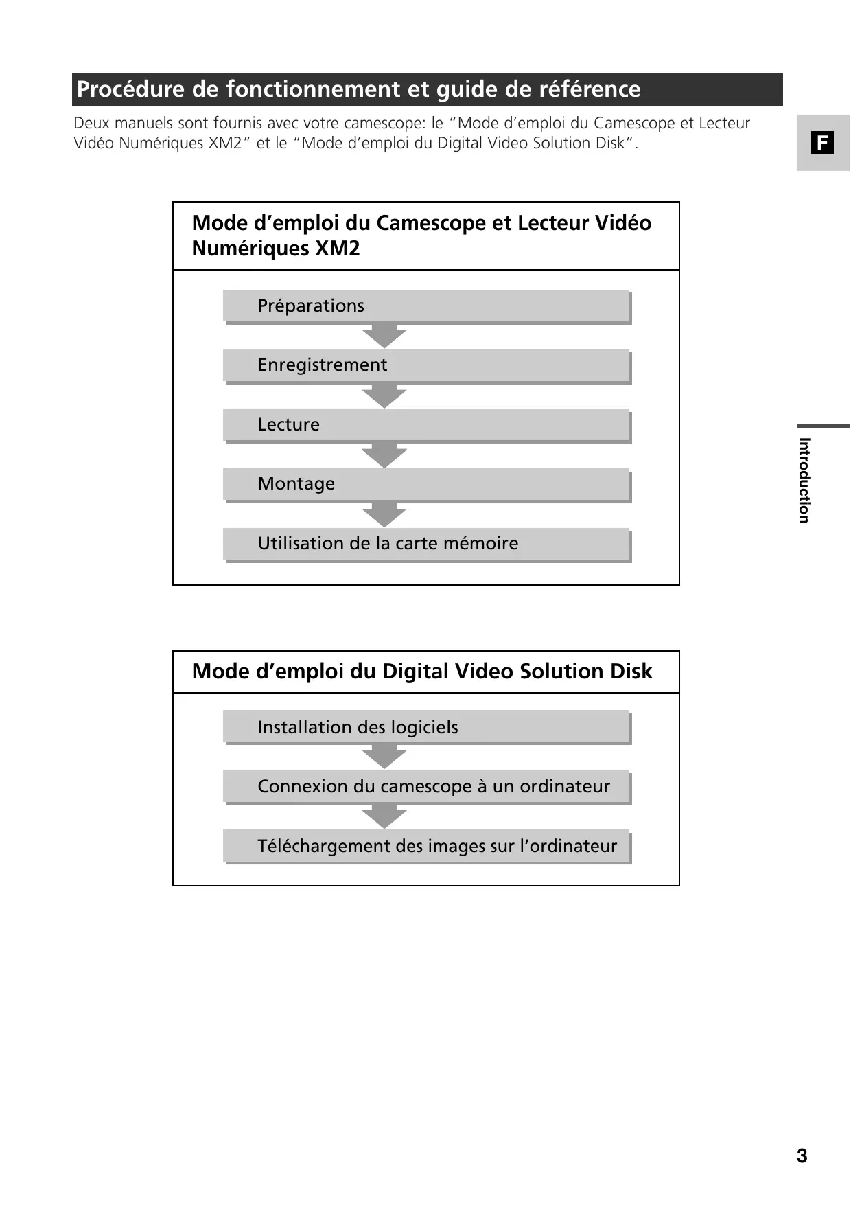 - L’utilisation d’un câble DV CV-150F/CV-250F est nécessaire pour être conforme aux exigences techniques de la directive EMC. Procédure de fonctionnement et guide de référence Deux manuels sont fournis avec votre camescope: le “Mode d’emploi du Camescope et Lecteur Vidéo Numériques XM2” et le “Mode d’emploi du Digital Video Solution Disk”.