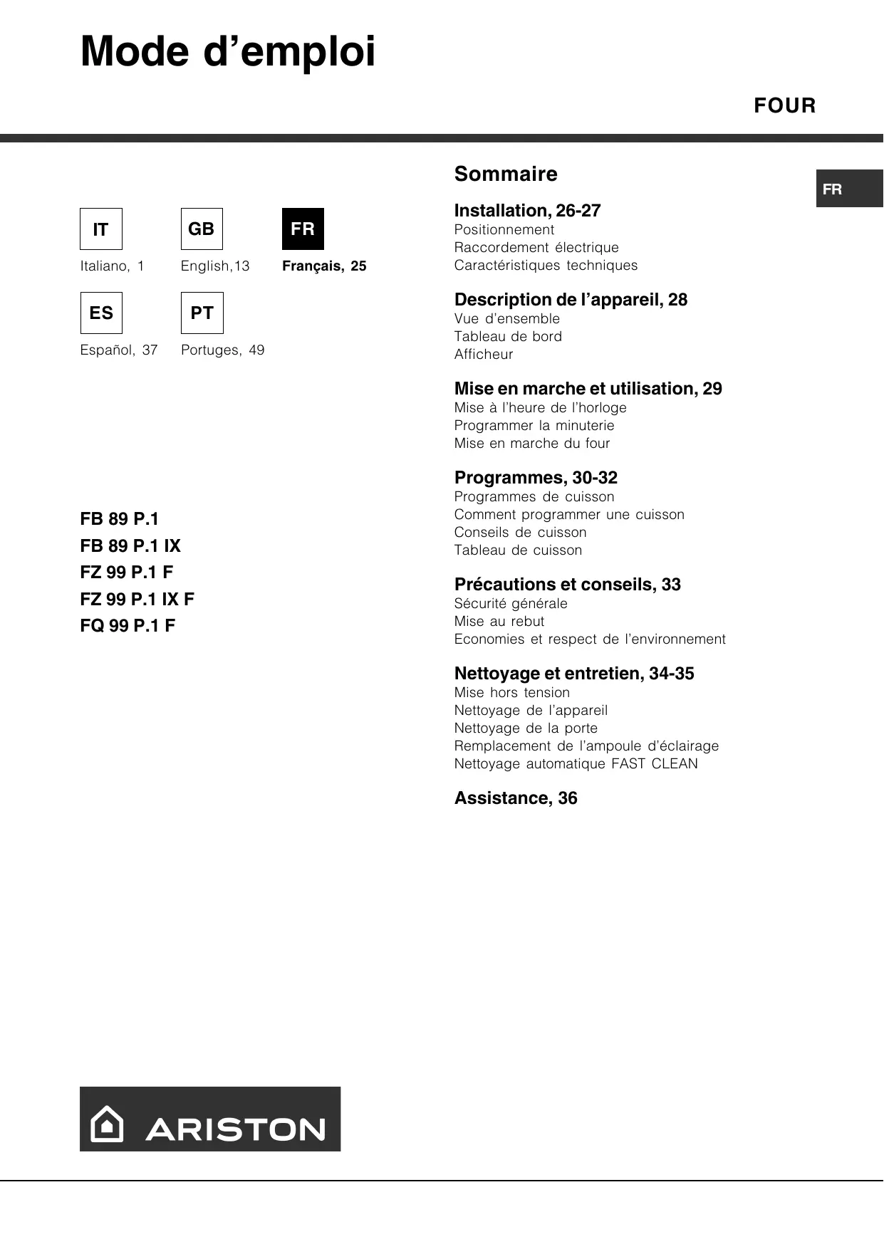Français, 25 Installation, 26-27 Positionnement Raccordement électrique Caractéristiques techniques Description de lappareil, 28 Vue densemble Tableau de bord Afficheur Mise en marche et utilisation, 29 Mise à lheure de lhorloge Programmer la minuterie Mise en marche du four Programmes, 30-32 FB 89 P.1 FB 89 P.1 IX FZ 99 P.1 F FZ 99 P.1 IX F FQ 99 P.1 F Programmes de cuisson Comment programmer une cuisson Conseils de cuisson Tableau de cuisson Précautions et conseils, 33 Sécurité générale Mise au rebut Economies et respect de lenvironnement Nettoyage et entretien, 34-35 Mise hors tension Nettoyage de lappareil Nettoyage de la porte Remplacement de lampoule déclairage Nettoyage automatique FAST CLEAN Assistance, 36