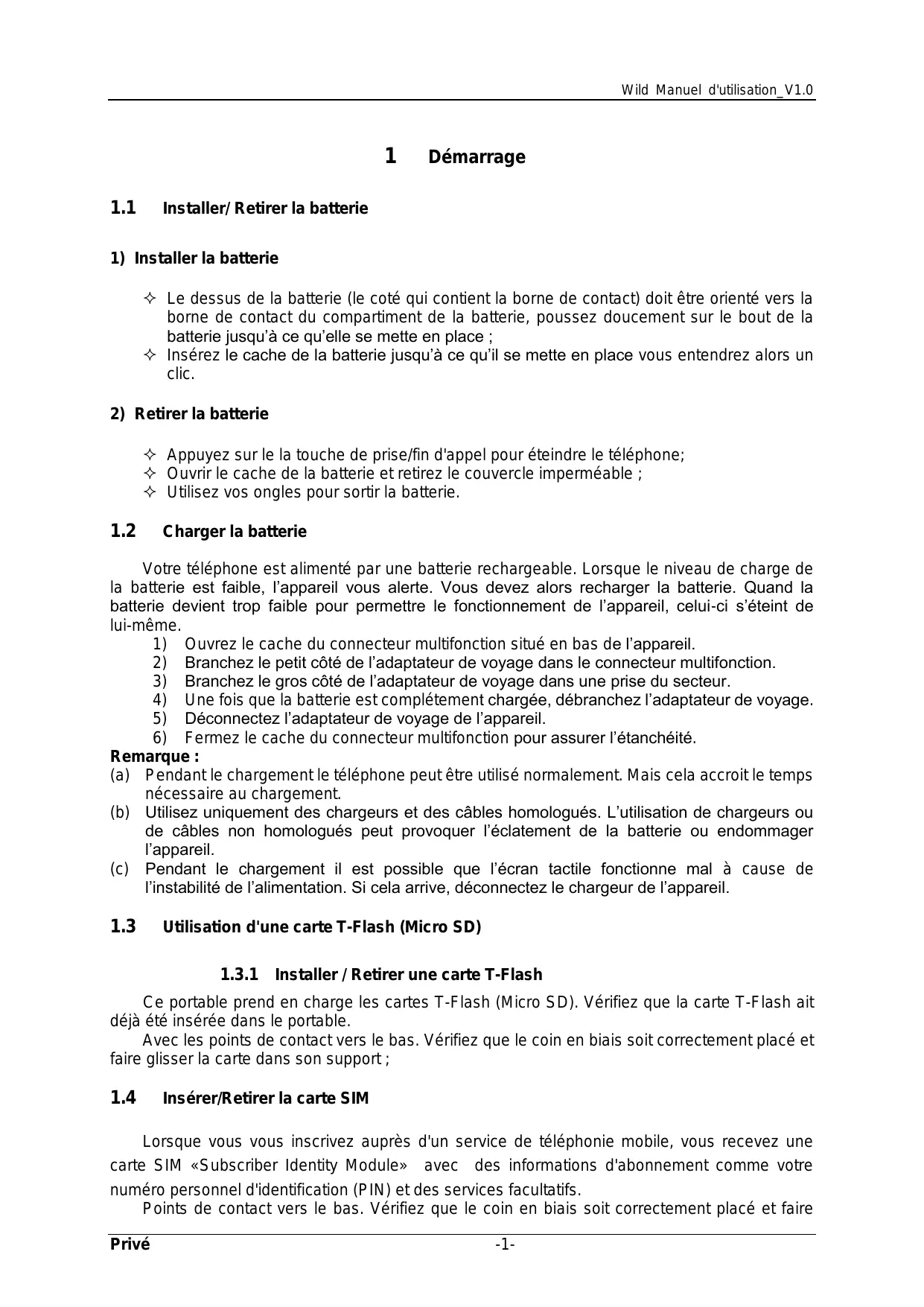 Wild Manuel d'utilisation_V1.0 glisser la carte dans son support ; Remarque : (a) Faites attention lorsque vous manipulez, insérez ou retirez la carte SIM, la friction ou le pliage peuvent l’endommager. (b) Si vous n'utilisez pas votre carte SIM, gardez-là hors de portée des enfants. (c) Conservez-la à l'abri de l'électricité statique, de la poussière et de l'humidité. (d) Lorsque vous allez insérer ou retirer une carte SIM, vérifiez que le téléphone soit bien éteint avant d'enlever la batterie. Le cas échéant vous risquez d'endommager la batterie.