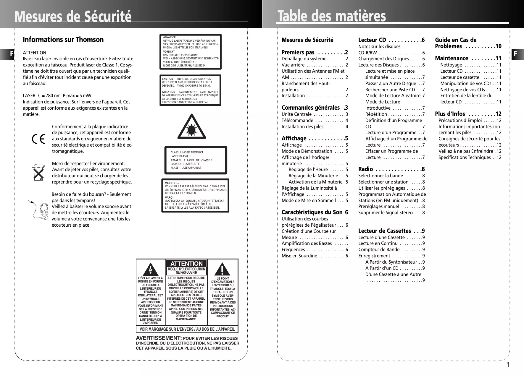 Table des matières Mesures de Sécurité Informations sur Thomson