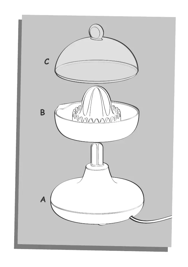 - Lorsque le fruit n’est plus en contact avec le cône plastique, l’appareil s’arrête automatiquement. Avant la première utilisation, lavez la pièce qui sera en contact avec les aliments ( B).