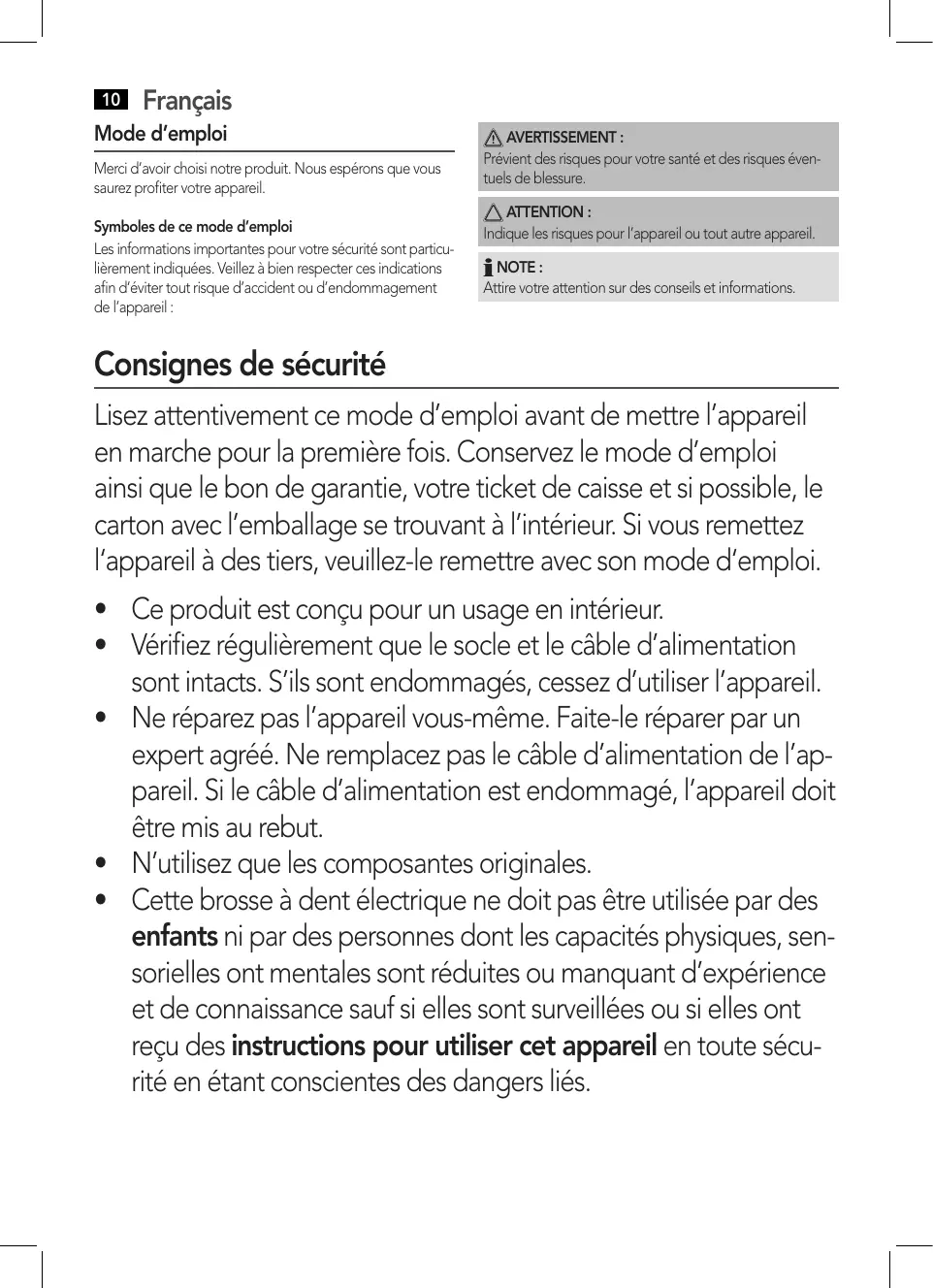 - Cette brosse à dent électrique ne doit pas être utilisée par des enfants ni par des personnes dont les capacités physiques, sensorielles ou mentales sont réduites ou manquant d'expérience et de connaissance, sauf si elles sont surveillées ou si elles ont reçu des instructions pour utiliser cet appareil en toute sécurité en étant conscientes des dangers liés.