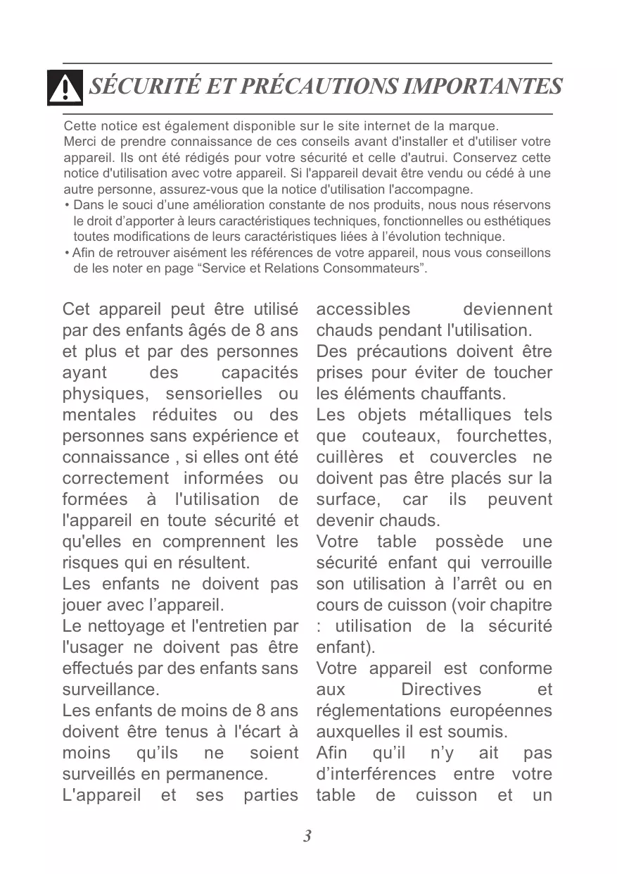 Des précautions doivent être prises pour éviter de toucher les éléments chauffants. Les objets métalliques tels que couteaux, fourchettes, cuillères et couvercles ne doivent pas être placés sur la surface, car ils peuvent devenir chauds. Votre table possède une sécurité enfant qui verrouille son utilisation à l’arrêt ou en cours de cuisson (voir chapitre : utilisation de la sécurité enfant). Votre appareil est conforme aux Directives et réglementations européennes auxquelles il est soumis. Afin qu’il n’y ait pas d’interférences entre votre table de cuisson et un 3