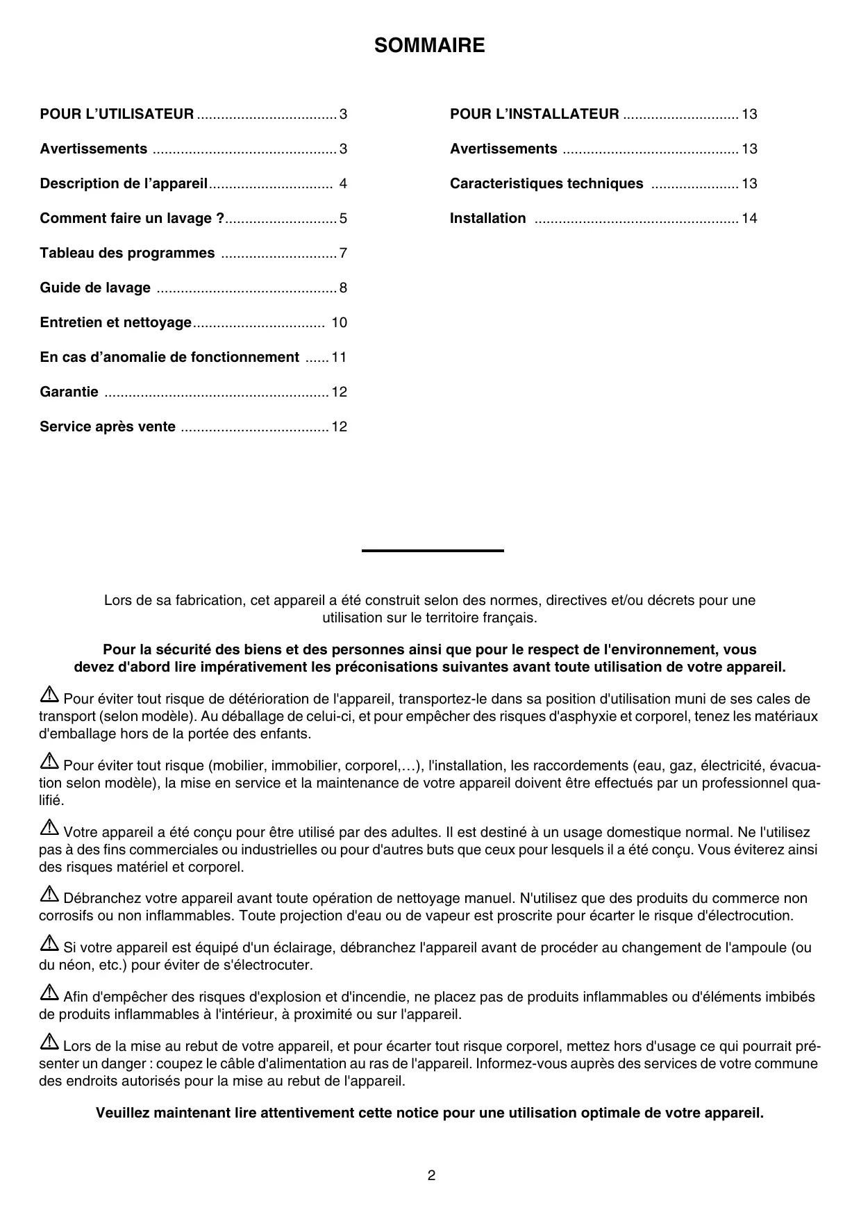 - Service après vente Lors de sa fabrication, cet appareil a été construit selon des normes, directives et/ou décrets pour une utilisation sur le territoire français. Pour la sécurité des biens et des personnes ainsi que pour le respect de l'environnement, vous devez d'abord lire impérativement les préconisations suivantes avant toute utilisation de votre appareil. Pour éviter tout risque de détérioration de l'appareil, transportez-le dans sa position d'utilisation muni de ses cales de transport (selon modèle). Au déballage de celui-ci, et pour empêcher des risques d'asphyxie et corporel, tenez les matériaux d'emballage hors de la portée des enfants. Pour éviter tout risque (mobilier, immobilier, corporel,…), l'installation, les raccordements (eau, gaz, électricité, évacuation selon modèle), la mise en service et la maintenance de votre appareil doivent être effectués par un professionnel qualifié. Votre appareil a été conçu pour être utilisé par des adultes. Il est destiné à un usage domestique normal. Ne l'utilisez pas à des fins commerciales ou industrielles ou pour d'autres buts que ceux pour lesquels il a été conçu. Vous éviterez ainsi des risques matériel et corporel. Débranchez votre appareil avant toute opération de nettoyage manuel. N'utilisez que des produits du commerce non corrosifs ou non inflammables. Toute projection d'eau ou de vapeur est proscrite pour écarter le risque d'électrocution. Si votre appareil est équipé d'un éclairage, débranchez l'appareil avant de procéder au changement de l'ampoule (ou du néon, etc.) pour éviter de s'électrocuter. Afin d'empêcher des risques d'explosion et d'incendie, ne placez pas de produits inflammables ou d'éléments imbibés de produits inflammables à l'intérieur, à proximité ou sur l'appareil. Lors de la mise au rebut de votre appareil, et pour écarter tout risque corporel, mettez hors d'usage ce qui pourrait présenter un danger : coupez le câble d'alimentation au ras de l'appareil. Informez-vous auprès des services de votre commune des endroits autorisés pour la mise au rebut de l'appareil. Veuillez maintenant lire attentivement cette notice pour une utilisation optimale de votre appareil. p. 12