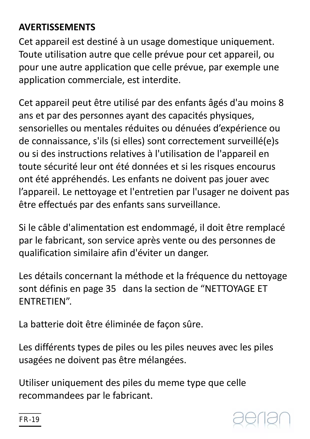 AAC90 AVERTISSEMENTS Cet appareil est destiné à un usage domestique uniquement. Toute utilisation autre que celle prévue pour cet appareil, ou pour une autre application que celle prévue, par exemple une application commerciale, est interdite. Cet appareil peut être utilisé par des enfants âgés d'au moins 8 ans et par des personnes ayant des capacités physiques, sensorielles ou mentales réduites ou dénuées d’expérience ou de connaissance, s'ils (si elles) sont correctement surveillé(e)s ou si des instructions relatives à l'utilisation de l'appareil en toute sécurité leur ont été données et si les risques encourus ont été appréhendés. Les enfants ne doivent pas jouer avec l’appareil. Le nettoyage et l'entretien par l'usager ne doivent pas être effectués par des enfants sans surveillance. Si le câble d'alimentation est endommagé, il doit être remplacé par le fabricant, son service après vente ou des personnes de qualification similaire afin d'éviter un danger. Les détails concernant la méthode et la fréquence du nettoyage sont définis en page 35 dans la section de “NETTOYAGE ET ENTRETIEN”. La batterie doit être éliminée de façon sûre. Les différents types de piles ou les piles neuves avec les piles usagées ne doivent pas être mélangées. Utiliser uniquement des piles du meme type que celle recommandees par le fabricant. FR-19 Les piles usagées doivent être enlevées de l'appareil. Les piles (piles installées) ne doivent pas être exposées à une chaleur excessive telle que celle du soleil, d'un feu ou d'origine similaire. Il convient d’attirer l’attention sur les problèmes d’environnement dus à la mise au rebut des piles usagées de façon sure. Déposez-les dans des bacs de collecte prévus pour cet effet (renseignez-vous auprès de votre revendeur afin de protéger l'environnement). Le fluide frigorigène utilisé dans cet appareil est un gaz à effet de serre fluoré qui peut être nocif pour l’environnement et peut être responsable du réchauffement global s’il s’échappe dans l’atmosphère. Le R-410A utilisé dans cet appareil est un gaz à effet de serre fluoré relevant du protocole de Kyoto, qui peut être nocif pour l’environnement et peut être responsable du réchauffement global s’il s’échappe dans l’atmosphère. Son potentiel de réchauffement global est 1975. FR-20