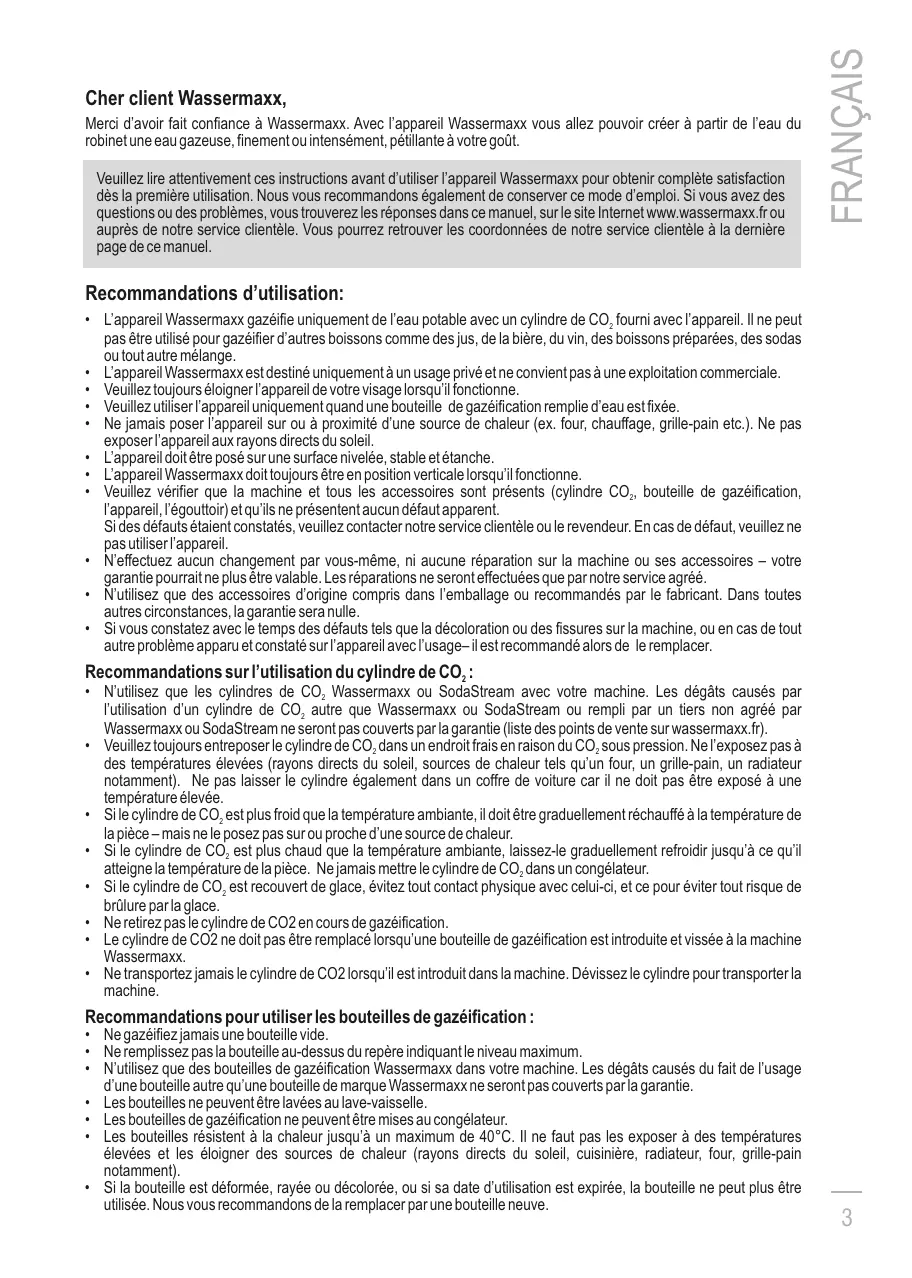 N'tilise que des bouteilles de gazificatation Wassermaxx dans voite machine. Les degats causes du fait de l'usage d'une bouteille autre qu'une bouteille de marque Wassermaxx ne seront pas couverts par la garantie. - Les bouteilles ne peuvent être lavées au lave-vaisselle.