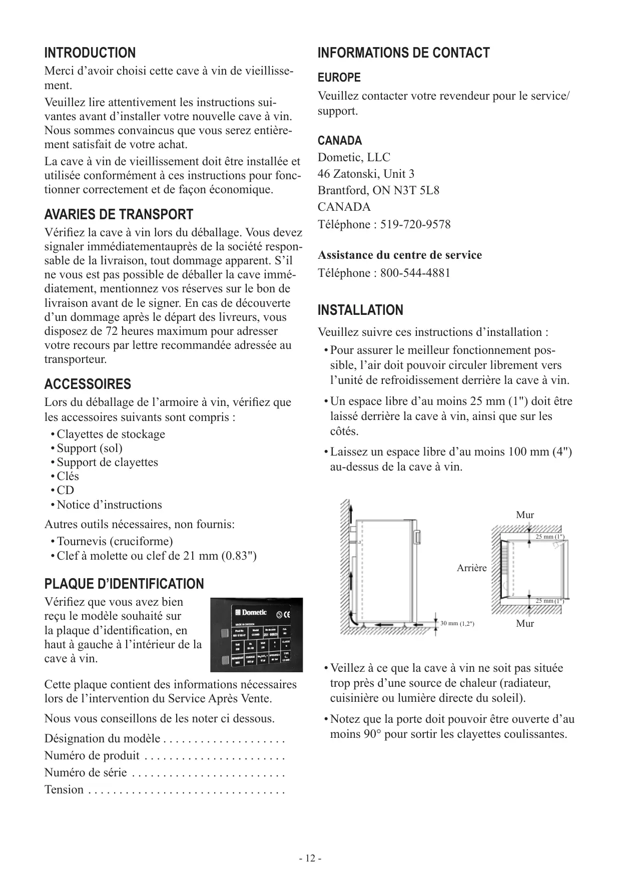- Valid for EU countries only. Waste Electrical and Electronic Equipment (WEEE) The European Union (EU) has implemented the WEEE Directive to ensure there are systems in place in the EU countries for the collection, treatment and recycling of waste electronic products. Products that are marked with the crossed-out wheeled bin should not be disposed as unsorted municipal waste. Introduction Merci d’avoir choisi cette cave à vin de vieillissement. Veuillez lire attentivement les instructions suivantes avant d’installer votre nouvelle cave à vin. Nous sommes convaincus que vous serez entièrement satisfait de votre achat. La cave à vin de vieillissement doit être installée et utilisée conformément à ces instructions pour fonctionner correctement et de façon économique. Avaries de transport Vérifiez la cave à vin lors du déballage. Vous devez signaler immédiatementauprès de la société responsable de la livraison, tout dommage apparent. S’il ne vous est pas possible de déballer la cave immédiatement, mentionnez vos réserves sur le bon de livraison avant de le signer. En cas de découverte d’un dommage après le départ des livreurs, vous disposez de 72 heures maximum pour adresser votre recours par lettre recommandée adressée au transporteur. Accessoires Informations de contact europe Veuillez contacter votre revendeur pour le service/ support. CANADA Dometic, LLC 46 Zatonski, Unit 3 Brantford, ON N3T 5L8 CANADA Téléphone : 519-720-9578 Assistance du centre de service Téléphone : 800-544-4881 Installation Veuillez suivre ces instructions d’installation :
