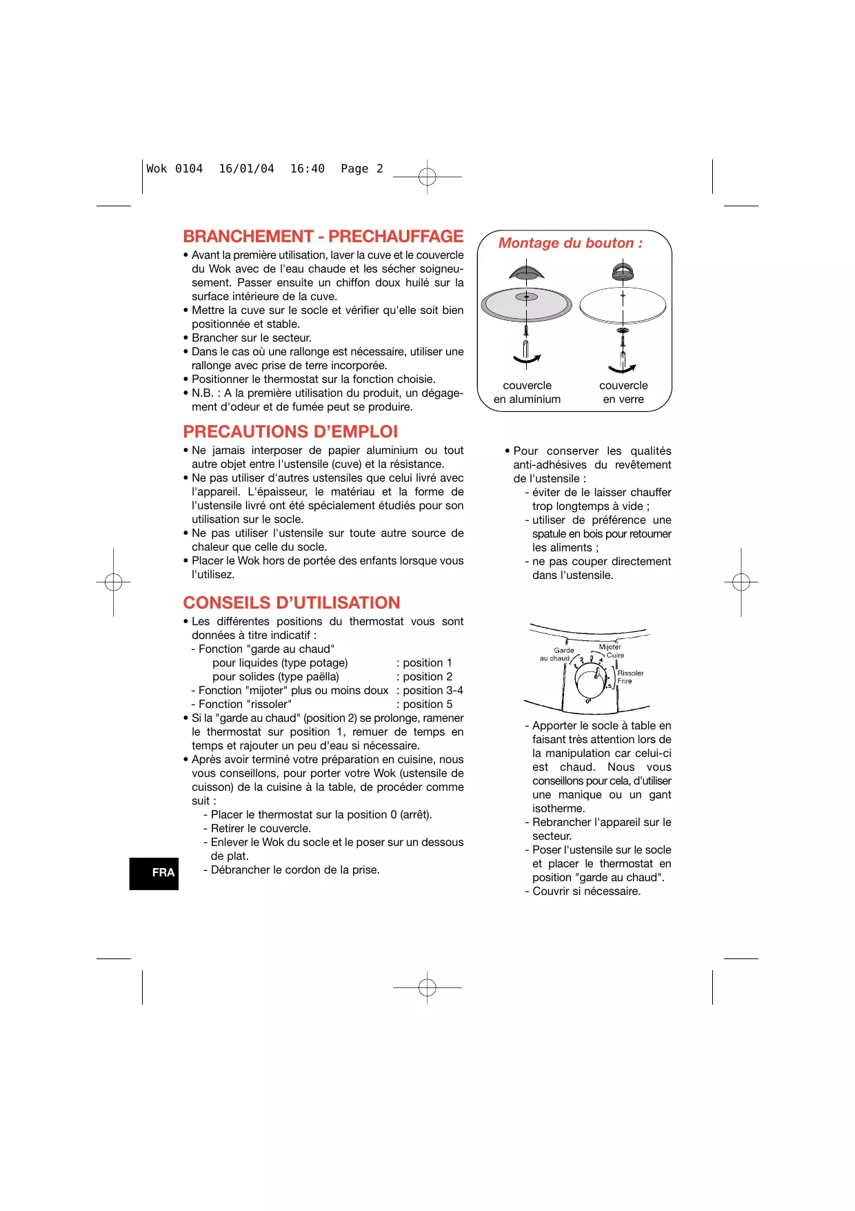• Après avoir terminé votre préparation en cuisine, nous vous conseillons, pour porter votre Wok (ustensile de cuisson) de la cuisine à la table, de procéder comme suit : - Placer le thermostat sur la position 0 (arrêt). - Retirer le couvercle. - Enlever le Wok du socle et le poser sur un dessous de plat. - Débrancher le cordon de la prise. FRA - Apporter le socle à table en faisant très attention lors de la manipulation car celui-ci est chaud. Nous vous conseillons pour cela, d'utiliser une manique ou un gant isotherme. - Rebrancher l'appareil sur le secteur. - Poser l'ustensile sur le socle et placer le thermostat en position "garde au chaud". - Couvrir si nécessaire. Wok 0104 16/01/04 16:40 Page 3