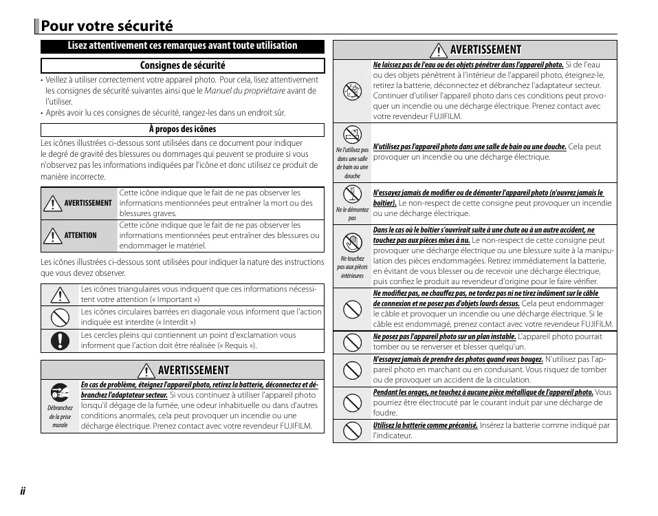 Ne laïsser pas de l'eau ou des objets pénérer dans l'appareil photo. Si de l'eau ou des objets pénéront à l'intérieur de l'appareil photo, éteigné-le, retirez la batterie, déconnectez et débranchez l'adaptateur secteur. Continuer d'utiliser l'appareil photo dans ces conditions peut provoquer un incendie ou une décharge électrique. Prenze contact avec cette revendeur FUJFILM.
