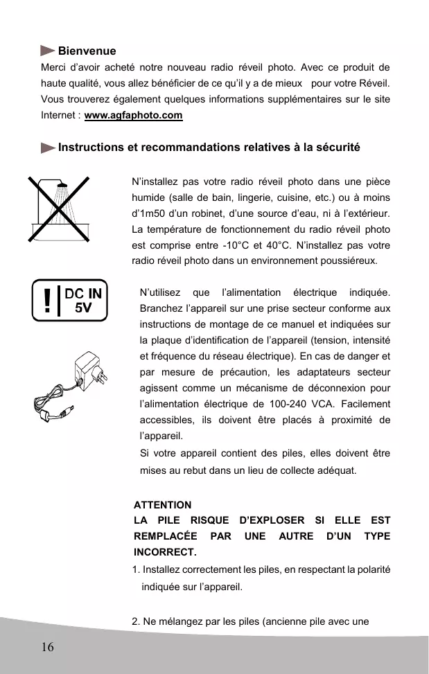 N'installez pas votre radio réveil photo dans une piece humide (salle de bain, lingerie, cuisine, etc.) ou à moins d'1m50 d'un robinet, d'une source d'eau, ni à l'extérieur. La température de fonctionnement du radio réveil photo est comprise entre -10°C et 40°C. N'installez pas votre radio réveil photo dans un environment poussièreux.