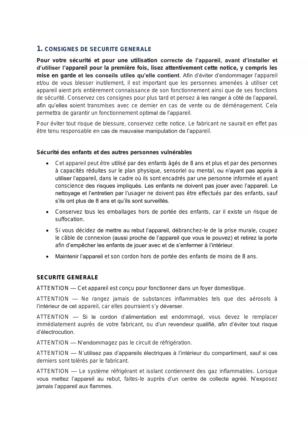 ATTENTION — Ne rangez jamais de substances inflammables tels que des aérosols à l’intérieur de cet appareil, car elles pourraient s’y déverser. ATTENTION — Si le cordon d’alimentation est endommagé, vous devez le remplacer immédiatement auprès de votre fabricant, ou d’un revendeur qualifié, afin d’éviter tout risque d’électrocution. ATTENTION — N’endommagez pas le circuit de réfrigération. ATTENTION — N’utilisez pas d’appareils électriques à l’intérieur du compartiment, sauf si ces derniers sont tolérés par le fabricant. ATTENTION — Le système réfrigérant et isolant contiennent des gaz inflammables. Lorsque vous mettez l’appareil au rebut, faites-le auprès d’un centre de collecte agréé. N’exposez jamais l’appareil aux flammes.