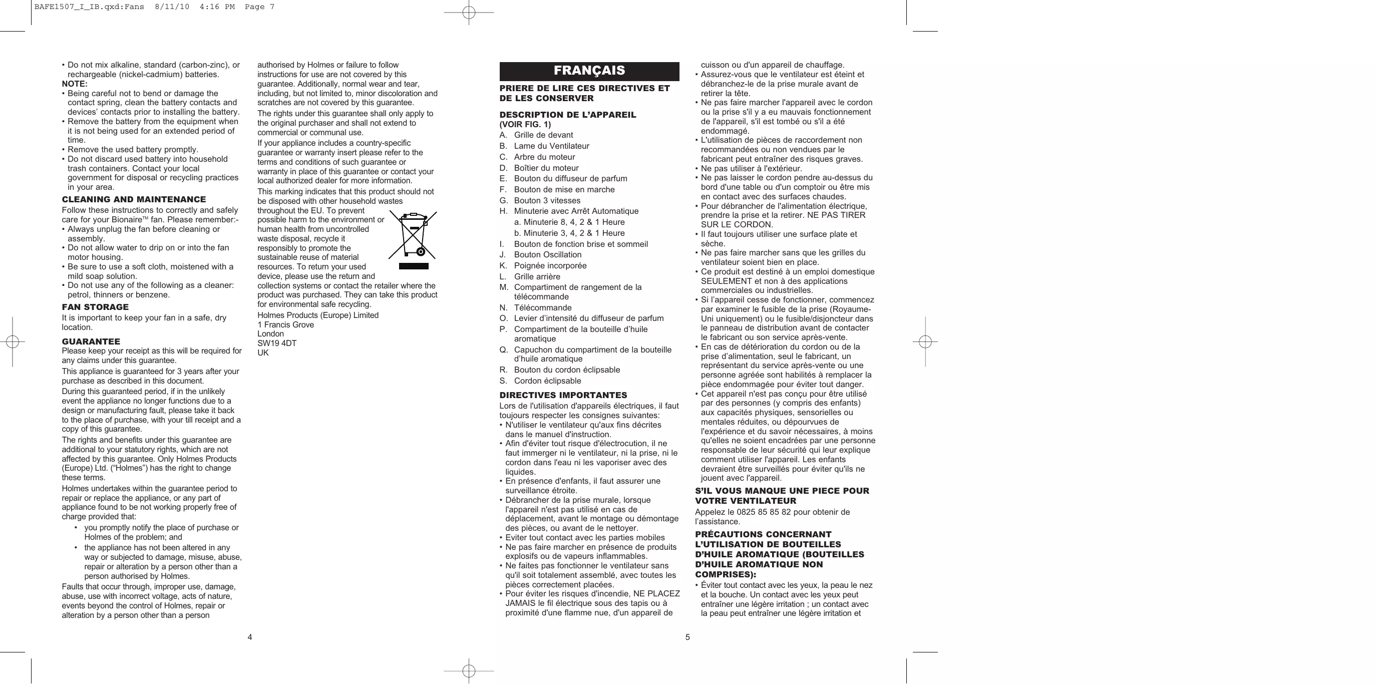 BAFE1507_I_IB.qxd:Fans 8/11/10 4:16 PM Page 11 DEUTSCH autre qu’une personne agréée par Holmes ou le non-respect des instructions d’utilisation. De plus, cette garantie ne couvre pas non plus l’usure normale, y compris, mais sans limitation, les petites décolorations et éraflures. Cette garantie s’applique uniquement à l’acheteur d’origine et elle n’étend aucun droit à toute personne acquérant l’appareil pour un usage commercial ou communal. Si votre appareil est accompagné d’une garantie locale ou d’une carte de garantie, veuillez en consulter les dispositions et conditions en vigueur, ou vous adresser à votre revendeur local pour en savoir plus. Ce label indique que ce produit ne doit pas être jeté avec les autres déchets ménagers dans l’ensemble de l’UE. Pour éviter les effets néfastes que l’élimination sauvage des déchets peut avoir sur l’environnement ou la santé, veillez à appliquer un recyclage responsable qui favorisera la réutilisation durable des ressources matérielles. Pour retourner un appareil usé, veuillez utiliser les systèmes de retour et de collecte ; vous pouvez aussi vous adresser au revendeur auprès duquel vous avez acheté l’appareil. Il sera en mesure d’assurer le recyclage écologique de ce produit. Holmes Products (Europe) Limited 1 Francis Grove London SW19 4DT