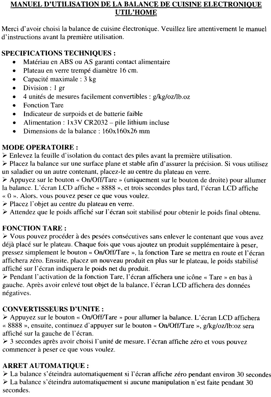 La balance s'éteindra automatiquement si l'écran affiche zéro pendant environ 30 secondes. La balance s'éteindra automatiquement si aucune manipulation n'est faite pendant 30 secondes.