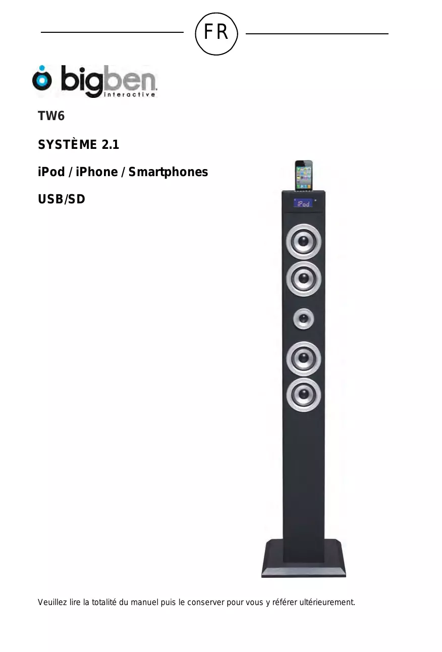 TW6 SYSTÈME 2.1 iPod / iPhone / Smartphones USB/SD Veuillez lire la totalité du manuel puis le conserver pour vous y référer ultérieurement. Table des Matières Prise en main